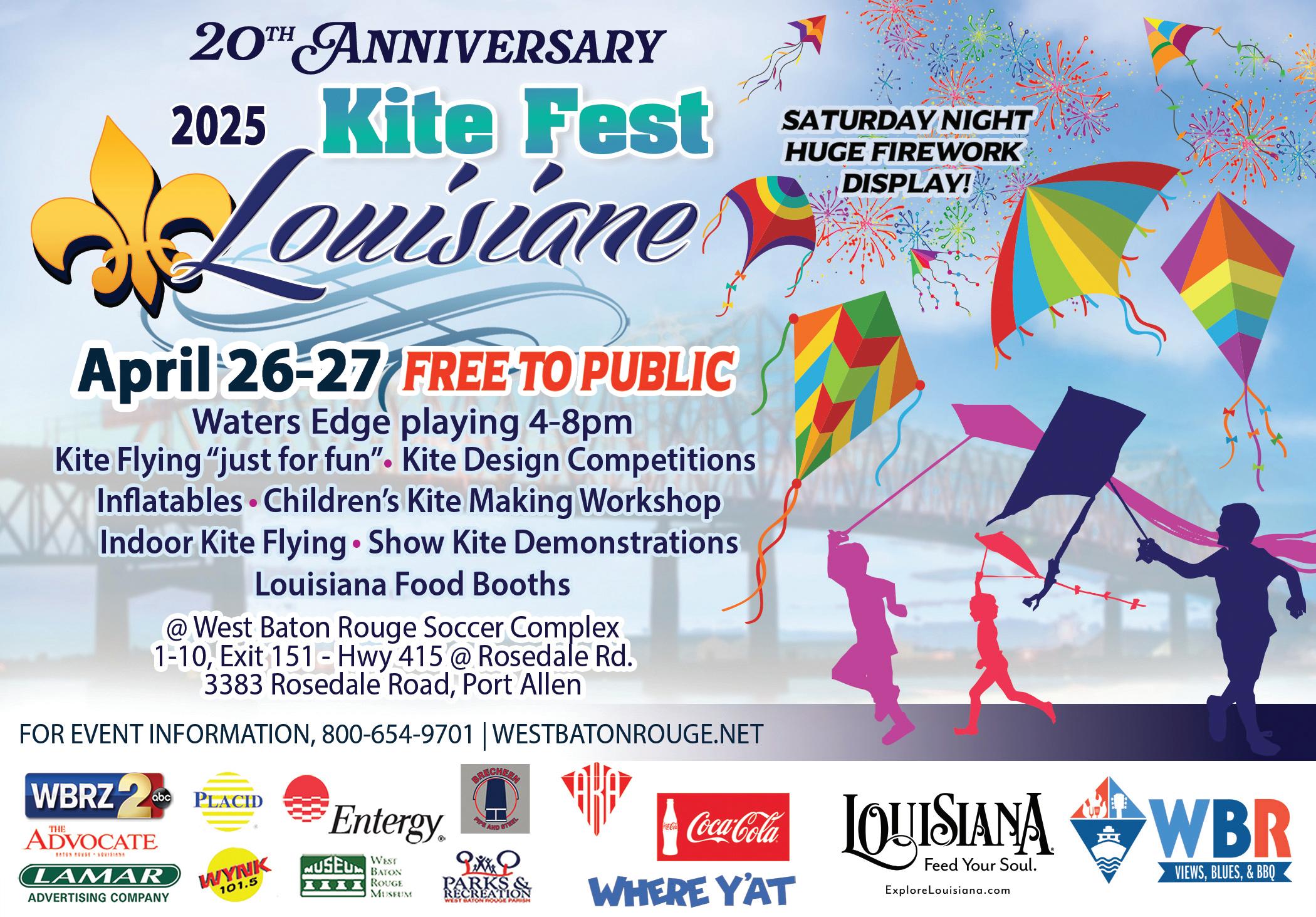 The 20th Anniversary Kite Fest is ready to fill the skies with color and life on April 26-27, 2025 in Port Allen. Named “Festival of the Year” by the Louisiana Travel Promotion Association and Top 20 Event by the Southeast Tourism Society, this free to the public event will feature Kite Design Competitions, Children’s Kite Making Workshops, Indoor Kite Flying, as well as Professional Kite Flying Teams and plenty of space to fly Kites just for fun. For musical accompaniment, Waters Edge will be playing from four to eight with a fireworks spectacular set to light up the night alongside specially lighted kites for a dazzling show you won’t want to miss! Be sure to bring your lawn chairs but leave the pets and ice chests at home. Join us for high flying fun! Kite Fest hours are 11:00 a.m. till fireworks at dusk on Saturday, April 26, 2025 and 11:00 a.m. – 4:00 p.m. on Sunday, April 27, 2025.