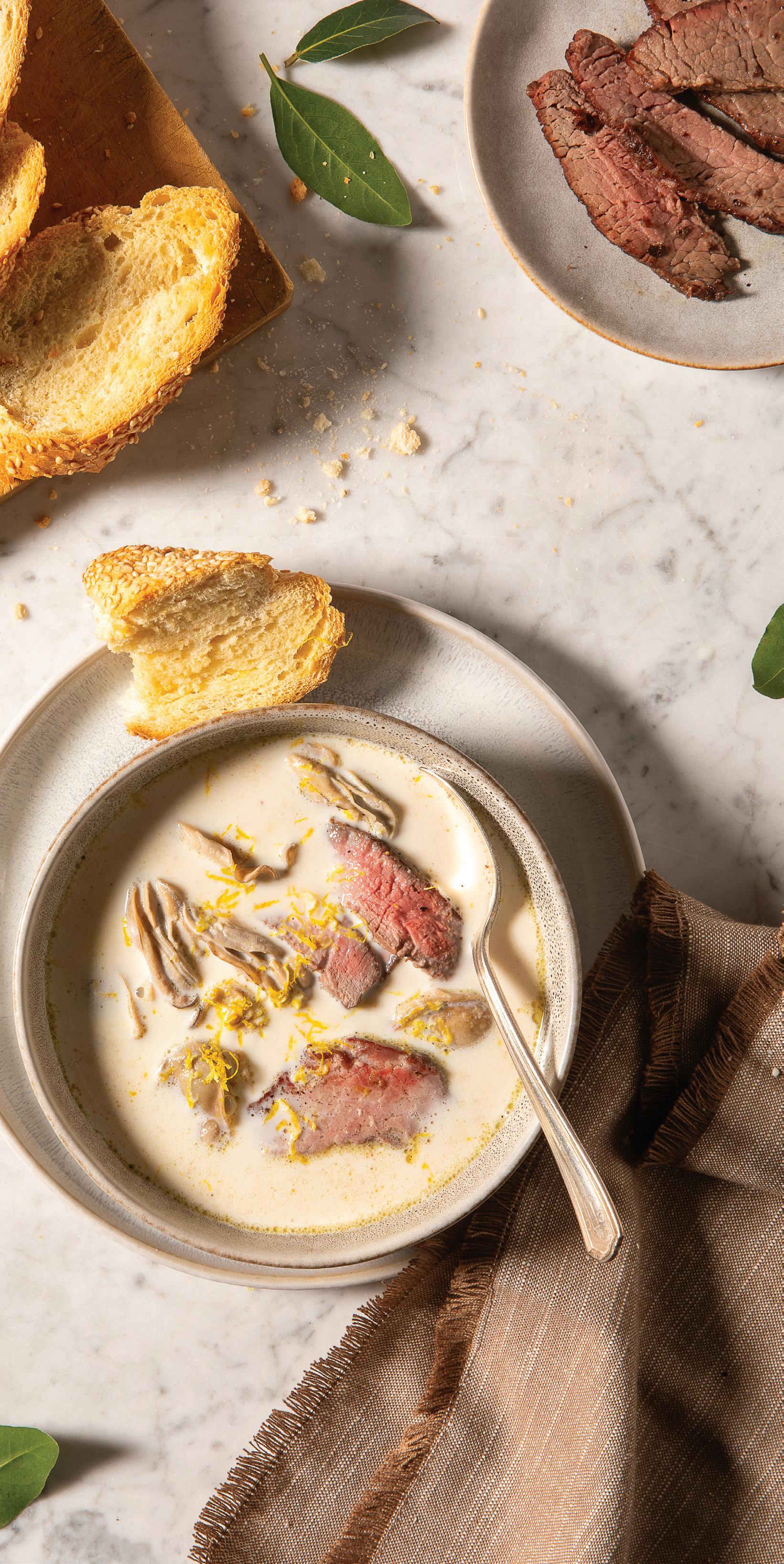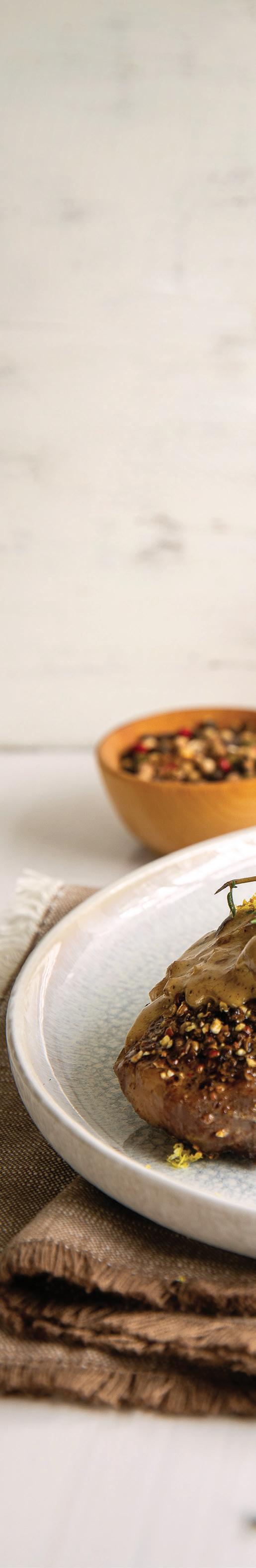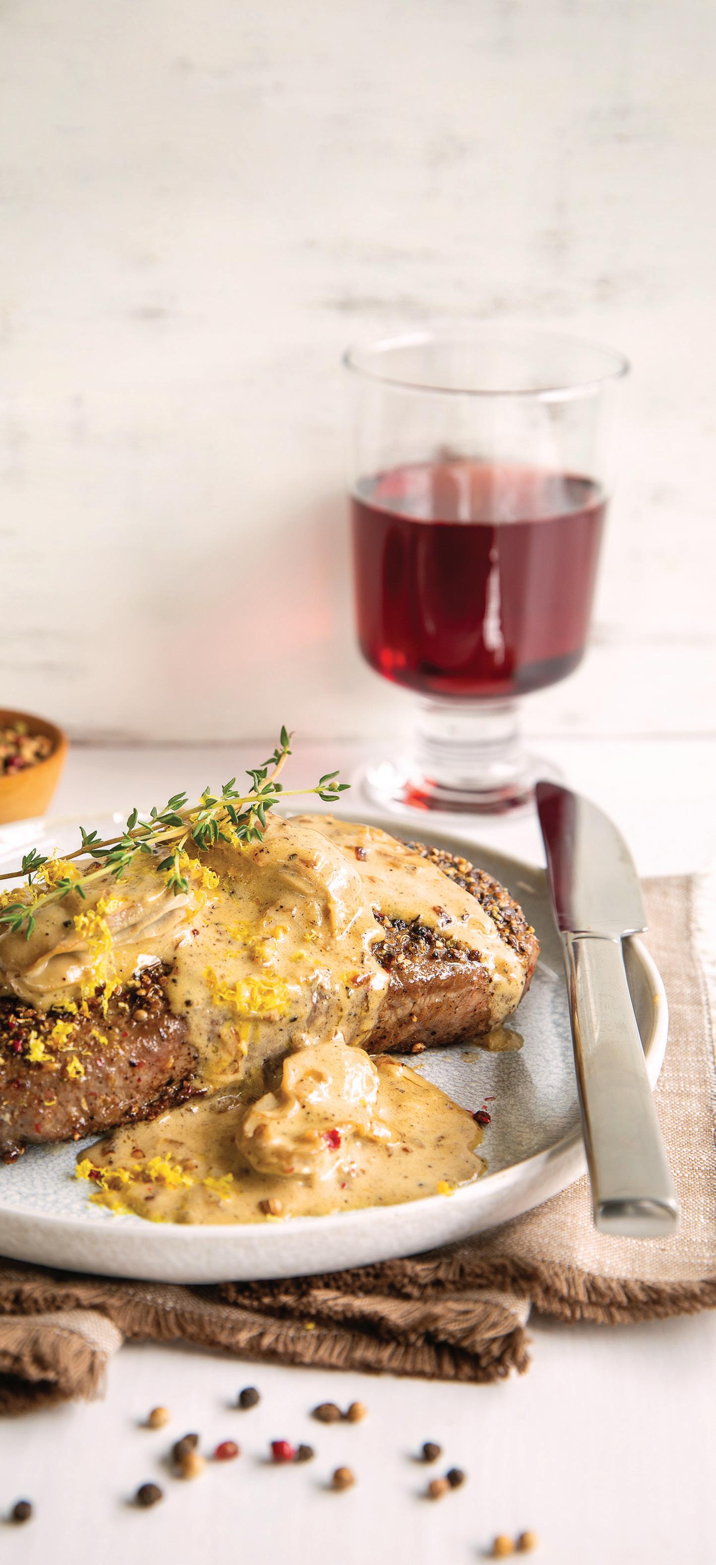 Peppercrusted strip steak, topped with oysters and a creamy brandy sauce