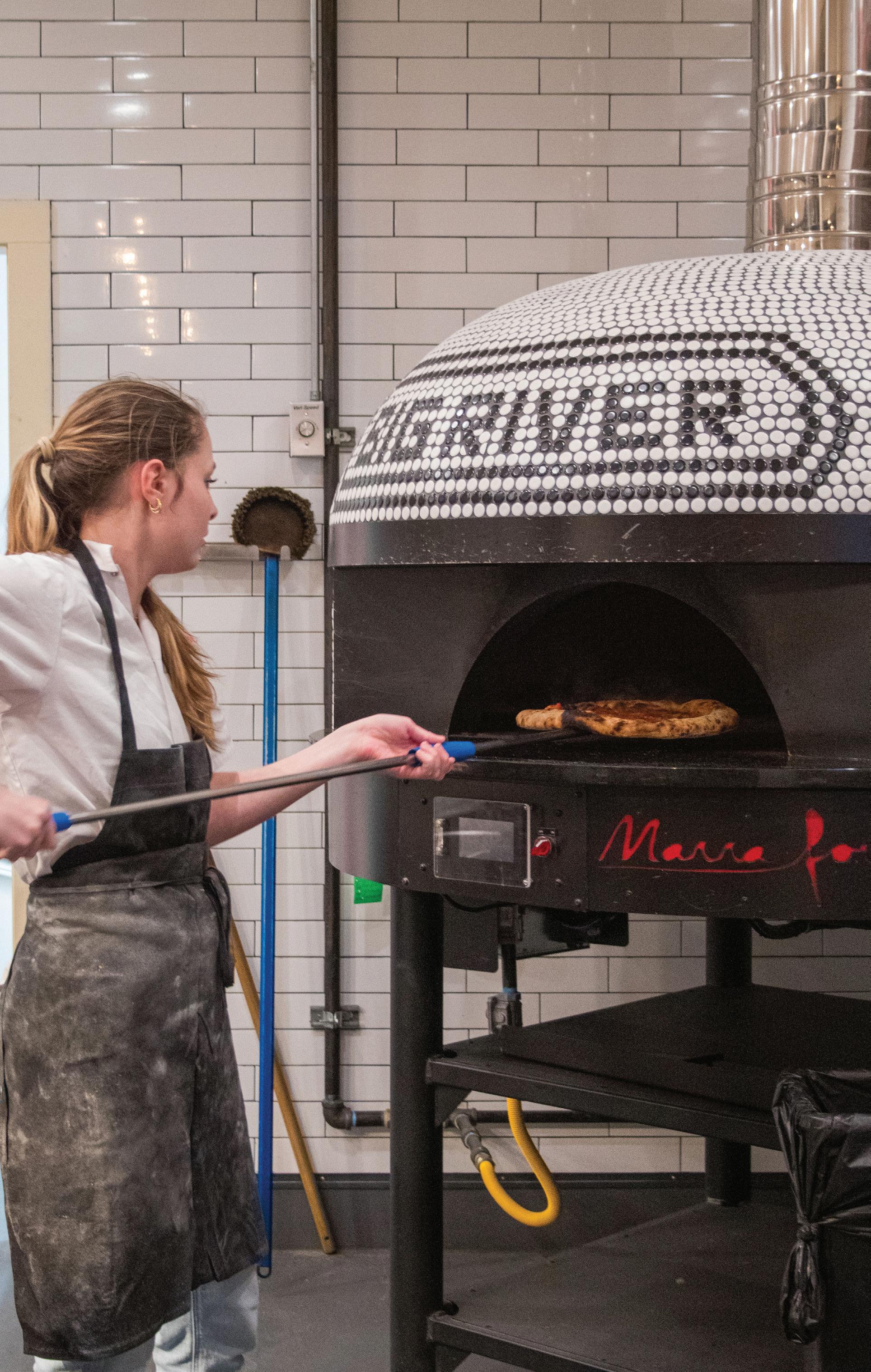 tours throughout the day) operates as a luxe boutique hotel with cottages, private homes and traditionally appointed hotel rooms available for guests, as well as Restaurant 1796 and the specialty coffee shop, both open to the public. Elta serves coffee from one of my favorite Acadiana roasters, Rêve Coffee Lab, so I was eager to try it. We grabbed a couple of hot lattes and took an amble around the property’s teal-hued pond encircled by rustic cottages. The pond is also home to a charming little floating cottage for a family of mallards and an island outfitted with Adirondack chairs and a firepit, accessible by an enchanting white footbridge. Our coffee walk coincided with dusk, adding another layer of mystery and dreaminess to the property as the pathways became illuminated and diners filed into the restaurant to savor Chef Daniel Dreher’s creations for the evening. While tempted, we had our hearts and palates set on a more casual experience for dinner — pizza. Having heard great things about Big River Pizza Co., we drove 1.6 miles back downtown. One fresh Caesar salad and an expertly wood-fired, bubbling Neapolitan-style pepperoni pizza later, I was surprised to discover I had room left for dessert at the adjoining (and