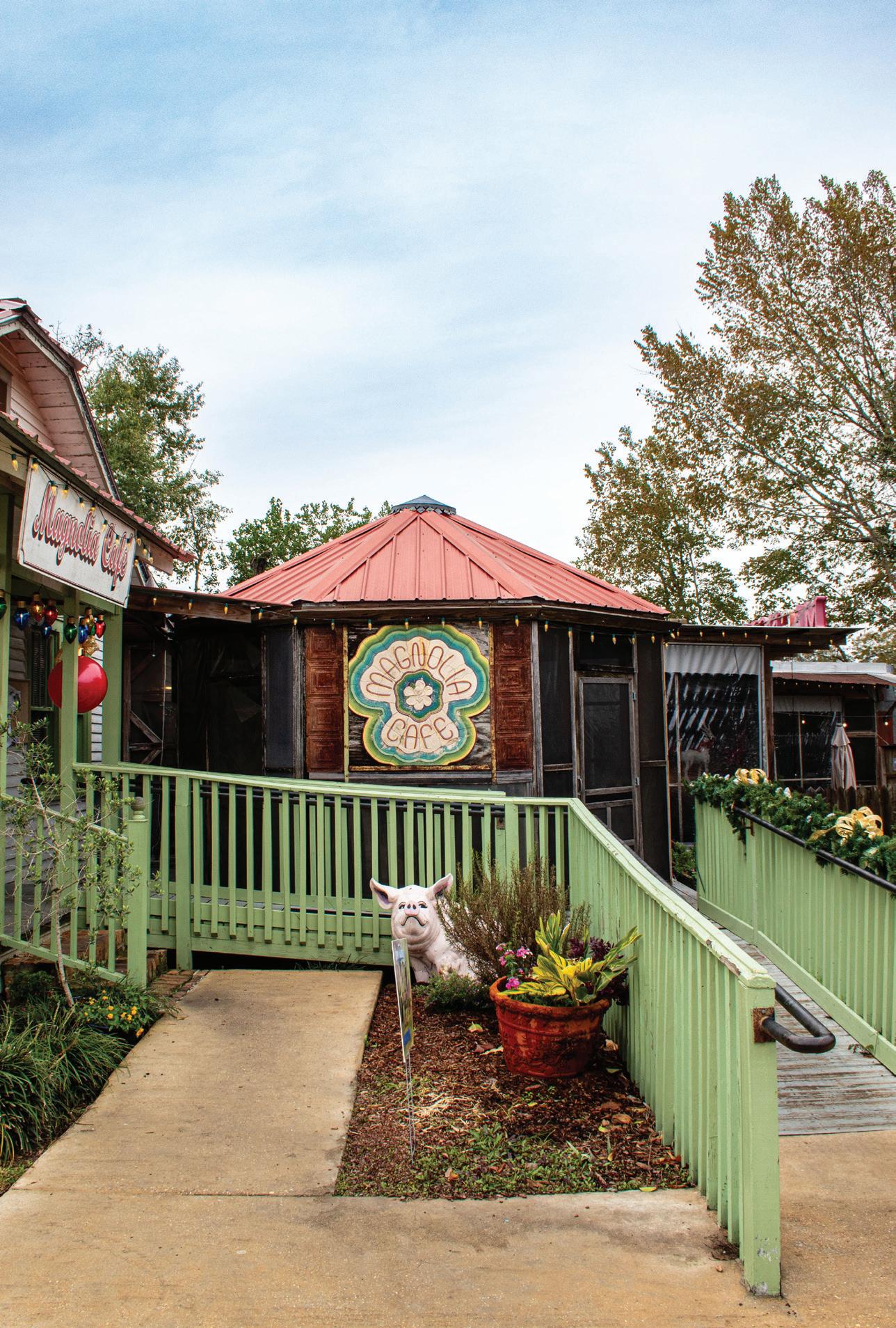 You can also enjoy items from the Big River Pizza Co. menu in this saucy setting. Proud Mary’s cured me of my speakeasy bias. On that note, we called it a night. While hiking the next day was still out of the question due to squishy, rain-soaked soil, we were able to squeeze in a tromp around Hemingbough Cultural Center and event venue. The Greek Revival-style architecture at Hemingbough belies its late ‘80s construction. With the grandeur of the buildings, reflection pond, sculptures, roaming peacocks (we counted 13), sunken garden maze, amphitheater, follies and Japanese garden, you’ll think you’ve been dropped into the set of a Jane Austen adaptation. The owner, developer Arlin Dease, keeps the grounds and gates open so visitors can enjoy the surrounding nature and his monumental vision. We worked up an appetite, so lunch at the Magnolia Cafe (the French Dip Poboy with au jus for me and a Famous Mag Burger for Mark) was a must.