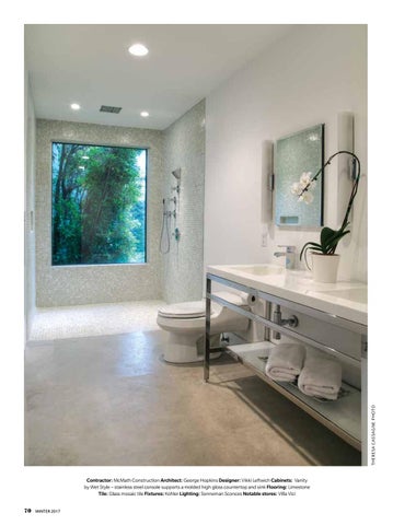 Contractor: McMath Construction Architect: George Hopkins Designer: Vikki Leftwich Cabinets: Vanity by Wet Style – stainless steel console supports a molded high gloss countertop and sink Flooring: Limestone Tile: Glass mosaic tile Fixtures: Kohler Lighting: Sonneman Sconces Notable stores: Villa Vici