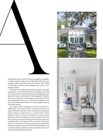 a white surface reflects light of all hues completely and diffusely. Most so-called whites are very light grays: fresh snow, for example, reflects about 80 percent of incidental light. White is the ultimate limit of a series of shades of any color. It is the opposite of black. Vikki Leftwich and Bryan Colwell own the paean to all things incandescent, their New Orleans home furnishings store Villa Vici. They are well versed in decorating and designing using a palette of every hue and shade of white imaginable. There is a lot more to it than just accumulating any and every white object and placing it into a room. A keen eye for lighting, a deft hand with subtlety and the ability to curate and layer a room is the stuff of dreams. The couple recently completed a gut job renovation of a 1960s house in Covington. This is a second home for them, a respite from their busy lives. When thinking of a second home being a getaway, a beach home or a country retreat usually springs to mind. The choice of Covington is unique, yet just right being both far enough from and convenient to the city. The charming town has cute shops and restaurants and is surrounded by the natural beauty of the area. There is Tammany Trace, a 31-mile bike trail running east and west through several communities on the north side of Lake Pontchartrain, and a laid back lifestyle perfect for relaxed weekends alone or for entertaining with friends and family.
