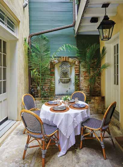 Top: A bedroom in a converted attic space feels fresh and cozy thanks to the Serena and Lily Buchanan bed in raffia, topped with Serena and Lily Soho sheeting in pink sand. Graci sourced the curved London metal bench at Ballard Designs and the pair of French 19th century walnut nightstands at Fireside Antiques in Baton Rouge. Bottom: The classic New Orleans courtyard is outfitted with the homeowners’ own rattan bistro chairs and a Shades of Light colonial lantern. Facing page:The dining room exudes youthful elegance with an antique Chinese chest from Kenny Ball Antiques, dining chairs covered in Schumacher Serengeti Tigre fabric, golden silk taffeta curtains and an art deco Chinese rug from Nashville Rug Gallery.