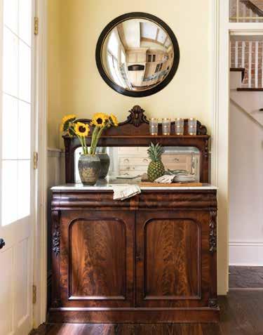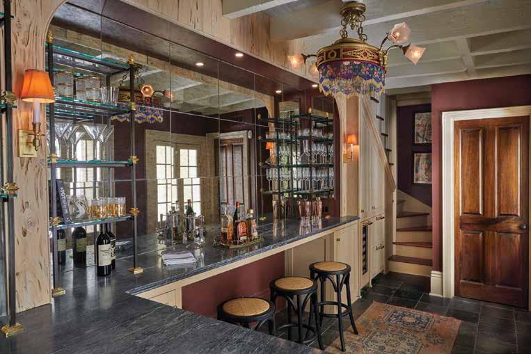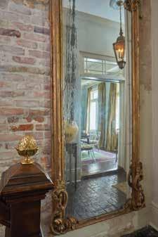 The room where the bar is now located was only about eight feet wide. When the homeowners mentioned that they wanted to — in true New Orleans fashion — turn it into a bar, Graci took the reins to transform the awkward space. Graci enlisted local metal artist David Rockhold to fabricate the iron and brass étagères. He then included cypress wood cabinetry, antique mirrors and glass shelving, and he relocated an antique beaded belle époque chandelier from the main house that now perfectly complements the design. The bar flows freely to the kitchen and an outdoor courtyard. Meanwhile, another found item, a large antique mirror that sits in the main hall, was regilded and restored, but just enough to make it still feel of the era.