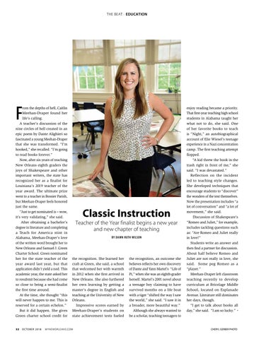 enjoy reading became a priority. That first-year teaching high school students in Alabama taught her what not to do, she said. One of her favorite books to teach is “Night,” an autobiographical account of Elie Wiesel’s teenage experience in a Nazi concentration camp. The first teaching attempt flopped. “A kid threw the book in the trash right in front of me,” she said. “I was devastated.” Reflection on the incident led to teaching style changes. She developed techniques that encourage students to “discover” the wonders of the text themselves. Now the presentation includes “a lot of conversation” and “a lot of movement,” she said. Discussion of Shakespeare’s “Romeo and Juliet,” for example, includes tackling questions such as: “Are Romeo and Juliet really in love?” Students write an answer and then find a partner for discussion. About half believe Romeo and Juliet are not really in love, she said. Some peg Romeo as a “player.” Meehan-Draper left classroom teaching recently to develop curriculum at Bricolage Middle School, located on Esplanade Avenue. Literature still dominates her days, though. “I get to talk about books all day,” she said. “I am so lucky.” •