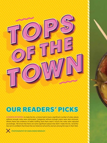OUR READERS’ PICKS A couple of notes: to make the list, a choice had to have a significant number of votes; places without enough votes were eliminated. Categories without enough voters were also removed. Where there was evidence of ballot stuffing (and there wasn’t much) the votes were adjusted accordingly. We know that there are some significant places that didn’t make the list, nevertheless we’re confident that those that are listed are all worthy and are among the tops in their field. PHOTOGRAPHY BY SARA ESSEX BRADLEY