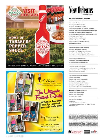 MAY 2019 / VOLUME 53 / NUMBER 5 Editor-in-Chief Errol Laborde Managing Editor Ashley McLellan Art Director Tiffani Reding Amedeo Contributing Writers Mary Lou Eichhorn, Fritz Esker, Kathy Finn, Dawn Ruth Wilson, Jason Berry, Carolyn Kolb, Chris Rose, Eve Crawford Peyton, Mike Griffith, Liz Scott Monaghan, Lee Cutrone, Dale Curry, Jay Forman, Tim McNally, Robert Peyton Digital Media Editor Kelly Massicot Social Media Assistant Becca Miller Staff Writers Topher Balfer, Kelly Massicot, Melanie Warner Spencer Vice President of Sales Colleen Monaghan Advertising Sales Manager Kate Henry (504) 830-7216 / Kate@MyNewOrleans.com Senior Account Executive Claire Cummings Account Executives Meggie Schmidt, Rachel Webber Event Coordinator Abbie Dugruise Digital Media Associate Mallary Matherne For event information call (504) 830-7264 Production Manager Emily Andras Production Designers Rosa Balaguer, Meghan Rooney Special Projects Art Director Molly Tullier Traffic Coordinator Lane Brocato Chief Executive Officer Todd Matherne President Alan Campell Executive Vice President Errol Laborde Distribution Manager John Holzer Administrative Assistant Mallary Matherne Subscriptions Manager Brittanie Bryant For subscription information call (504) 828-1380 WYES DIAL 12 STAFF (504) 486-5511 Executive Editor Aislinn Hinyup Associate Editor Robin Cooper Art Director Jenny Hronek NEW ORLEANS MAGAZINE Printed in USA A Publication of Renaissance Publishing 110 Veterans Memorial Blvd., Suite 123, Metairie, LA 70005 MyNewOrleans.com