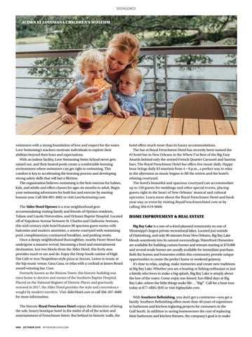 swimmers with a strong foundation of love and respect for the water. Love Swimming’s teachers motivate individuals to explore their abilities beyond their fears and expectations. With an indoor facility, Love Swimming Swim School never gets rained out, and their heated pools create a comfortable learning environment where swimmers can get right to swimming. This comfort is key to accelerating the learning process and developing strong safety skills that will last a lifetime. The organization believes swimming is the best exercise for babies, kids, and adults and offers classes for ages six months to adult. Begin your swimming adventures for both fun and exercise by starting lessons now. Call 504-891-4662 or visit LoveSwimming.com. The Alder Hotel Uptown is a true neighborhood gem accommodating visiting family and friends of Uptown residents, Tulane and Loyola Universities, and Ochsner Baptist Hospital. Located off of Napoleon Avenue between St. Charles and Claiborne Avenues, this mid-century style hotel features 90 spacious guest rooms with balconies and modern amenities, a serene courtyard with swimming pool, complimentary continental breakfast, and parking onsite. Once a sleepy neighborhood thoroughfare, nearby Freret Street has undergone a massive revival, becoming a food and entertainment destination. Just two blocks from the Alder Hotel, this lively area provides much to see and do. Enjoy the Deep South cuisine of High Hat Café or true Neapolitan-style pizza at Ancora. Listen to music at the hip music venue, Gasa Gasa, or relax with a cocktail at James Beard award-winning bar, Cure. Formerly known as the Bristow Tower, this historic building was once home to doctors and nurses of the Southern Baptist Hospital. Placed on the National Register of Historic Places and graciously restored in 2017, the Alder Hotel provides the style and convenience sought by modern travelers. Visit AlderHotel.com or call 504-207-4600 for more information. The historic Royal Frenchmen Hotel enjoys the distinction of being the sole, luxury boutique hotel in the midst of all of the action and entertainment of Frenchmen Street. But behind its historic walls, the 1 0 4 OCTOBER 2019 myneworleans.com