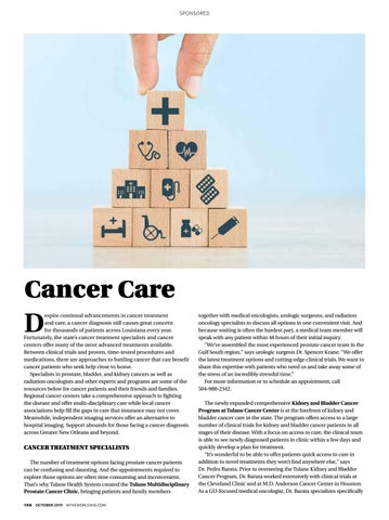 Cancer Treatment Specialists The number of treatment options facing prostate cancer patients can be confusing and daunting. And the appointments required to explore those options are often time consuming and inconvenient. That’s why Tulane Health System created the Tulane Multidisciplinary Prostate Cancer Clinic, bringing patients and family members 1 0 6 OCTOBER 2019 myneworleans.com