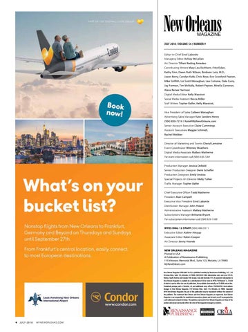 JULY 2018 / VOLUME 54 / NUMBER 9 Editor-in-Chief Errol Laborde Managing Editor Ashley McLellan Art Director Tiffani Reding Amedeo Contributing Writers Mary Lou Eichhorn, Fritz Esker, Kathy Finn, Dawn Ruth Wilson, Brobson Lutz, M.D., Jason Berry, Carolyn Kolb, Chris Rose, Eve Crawford Peyton, Mike Griffith, Liz Scott Monaghan, Lee Cutrone, Dale Curry, Jay Forman, Tim McNally, Robert Peyton, Mirella Cameran, Alexa Renee Harrison Digital Media Editor Kelly Massicot Social Media Assistant Becca Miller Staff Writers Topher Balfer, Kelly Massicot, Vice President of Sales Colleen Monaghan Advertising Sales Manager Kate Sanders Henry (504) 830-7216 / Kate@MyNewOrleans.com Senior Account Executive Claire Cummings Account Executives Meggie Schmidt, Rachel Webber Director of Marketing and Events Cheryl Lemoine Event Coordinator Whitney Weathers Digital Media Associate Mallary Matherne For event information call (504) 830-7264 Production Manager Jessica DeBold Senior Production Designer Demi Schaffer Production Designers Emily Andras Special Projects Art Director Molly Tullier Traffic Manager Topher Balfer Chief Executive Officer Todd Matherne President Alan Campell Executive Vice President Errol Laborde Distribution Manager John Holzer Administrative Assistant Mallary Matherne Subscriptions Manager Brittanie Bryant For subscription information call (504) 828-1380 WYES DIAL 12 STAFF (504) 486-5511 Executive Editor Aislinn Hinyup Associate Editor Robin Cooper Art Director Jenny Hronek NEW ORLEANS MAGAZINE Printed in USA A Publication of Renaissance Publishing 110 Veterans Memorial Blvd., Suite 123, Metairie, LA 70005 MyNewOrleans.com New Orleans Magazine (ISSN 0897 8174) is published monthly by Renaissance Publishing, LLC., 110 Veterans Blvd., Suite 123, Metairie, LA 70005; (504) 828-1380. Subscription rates: one year $19.95; Mexico, South America and Canada $48; Europe, Asia and Australia $75. An associate subscription to New Orleans Magazine is available by a contribution of $40 or more to WYES-TV/Channel 12, $10.00 of which is used to offset the cost of publication. Also available electronically, on CD-ROM and on-line. Periodicals postage paid at Metairie, LA, and additional entry offices. POSTMASTER: Send address changes to New Orleans Magazine, 110 Veterans Blvd., Suite 123, Metairie, LA 70005. Copyright 2018 New Orleans Magazine. No part of this publication may be reproduced without the consent of the publisher. The trademark New Orleans and New Orleans Magazine are registered. New Orleans Magazine is not responsible for unsolicited manuscripts, photos and artwork even if accompanied by a self-addressed stamped envelope. The opinions expressed in New Orleans Magazine are those of the authors and do not necessarily reflect the view of the magazine managers or owners.