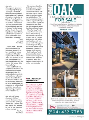 Dear Julia, I have a picture of my maternal great grandfather Judge Louis Edgar Arnoult with George Riviere. Judge Arnoult and Mr. Riviere were members of two pioneering families of Jefferson Parish. The picture was taken at the Jefferson Parish Racetrack, Shrewsbury in 1910. The picture is included in two publications: Metairie: A Tongue of Land to Pasture, by Msgr. Henry C. Bezou and Legendary Locals of Metairie, by Catherine Campanella. Do you or Poydras know where this racetrack was located? Thanks, Jack Schott New Orleans Opened in 1917, the track prospered until the Great Depression, when it fell on hard times. Racing enthusiasts take note: When thoroughbred Black Gold won the 1924 Louisiana Derby, he did so at Jefferson Race Track. Later, the Oklahoma-bred colt won the 50th running of the Kentucky Derby. In the late 1940s, the 82acre Jefferson Race Track site was sold and redeveloped as the new Jefferson Park residential subdivision. Jefferson Park Avenue is the main street in the neighborhood, the streets of which are laid out in concentric ovals recalling the former racetrack. The entrance to the Jefferson Park subdivision faces Jefferson Highway, roughly opposite Riverdale High School. Dear Julia and Poydras, I have a dim childhood memory about a sweet strawberry soda called Pop Rouge. I haven’t seen it in years and I can’t honestly say I’ve missed the stuff. Do you remember it or know who made it? Felix Flynn New Orleans