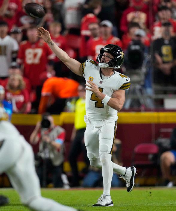 quarterback Derek Carr completed 375-of-548 passes (68.4%) for 3,878 yards with 25 touchdowns to just eight interceptions and a 97.7 passer rating. Over the last six games, Carr was 131-of-176 (leaguebest 74.4 %) for 1,343 yards with an NFL-best 15 touchdowns, only three picks and a league-high 117.2 passer rating. The passing game was highlighted by further development from the second-year duo of Chris Olave and Rashid Shaheed. Olave led the team with 87 receptions for 1,123 yards and five touchdowns, and Shaheed caught 46 passes for 719 yards (15.6 avg.) with five scoring grabs.