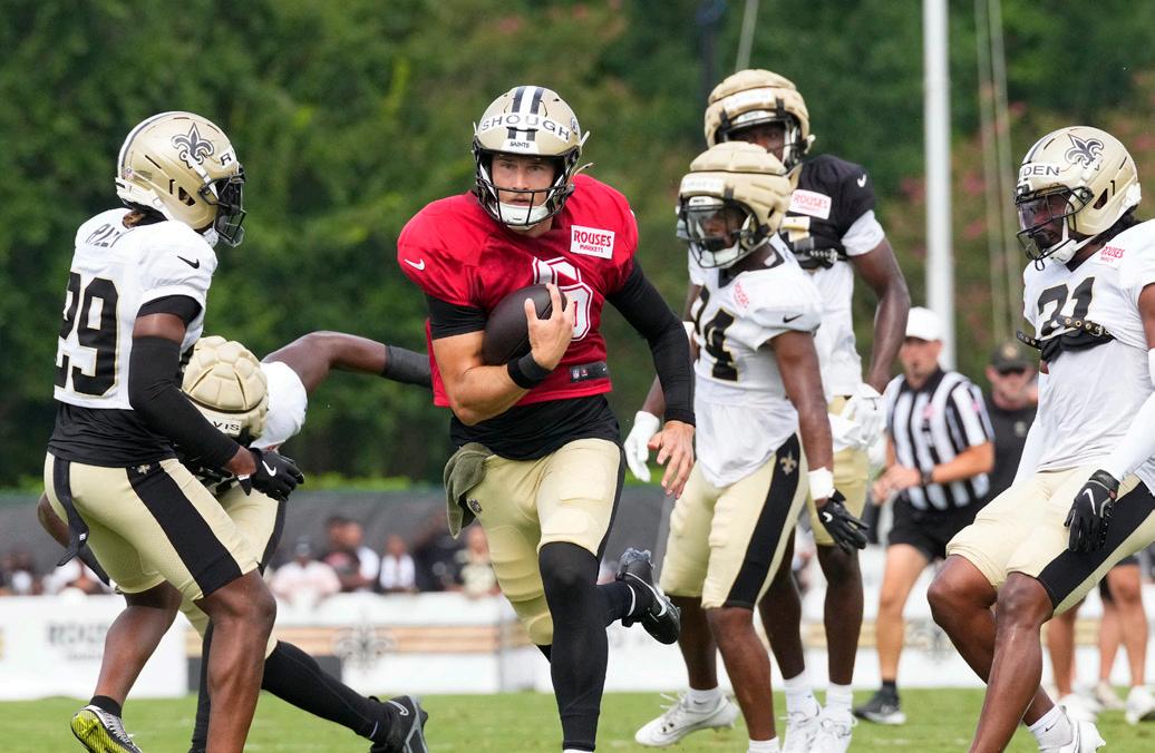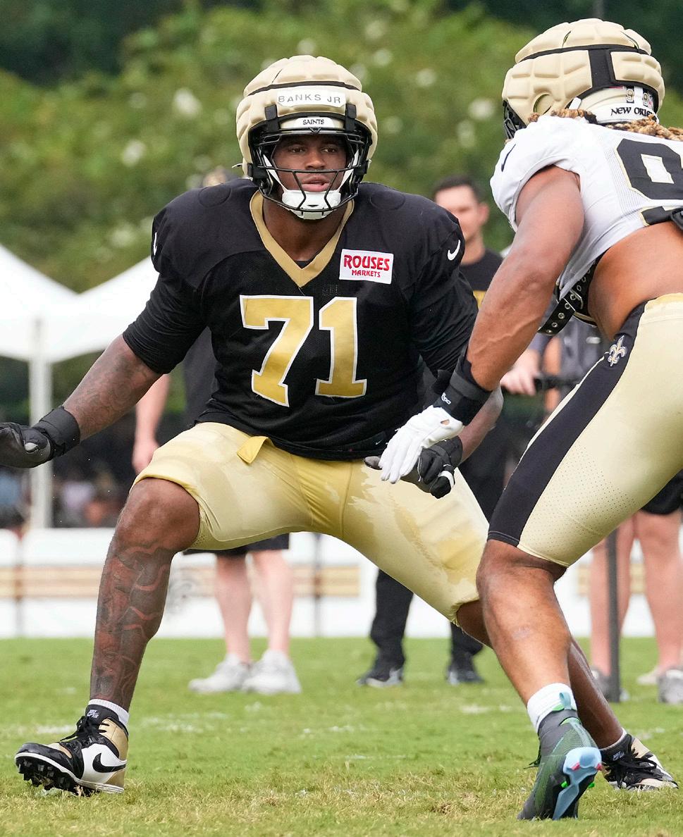 original college position at left tackle, while Taliese Fuaga, the Saints’ first round selection in 2024, will return to his college position of right tackle after opening every contest on the left side as a rookie. Shough will battle with Spencer Rattler and Jake Haener for the starting spot. Defense took over for the next four selections in the draft after Banks and Shough, with DT Vernon Broughton (Texas), S Jonas Sanker (Virginia), LB Danny Stutsman (Oklahoma) and CB Quincy Riley (Louisville). Broughton and Stutsman will both look to learn from some of the best in the business, from trade acquisition Davon Godchaux to a 13-year NFL veteran linebacker in Davis. Sanker and Riley will look to provide depth in the secondary and learn from some veterans in Alontae Taylor, Julian Blackmon and Justin Reid. RB Devin Neal (Kansas), TE Moliki Matavao (UCLA) and DE Fadil Diggs (Syracuse) rounded out the draft for the Black and Gold. Neal and Matavao look to add value to rooms with talent skill positions, and Diggs hopes to bring a young spark into a seasoned defensive end unit. Each and every one of the new rookies will make competition fierce, which Moore and the rest of the coaching sta hope to light a fire under players of all experiences.