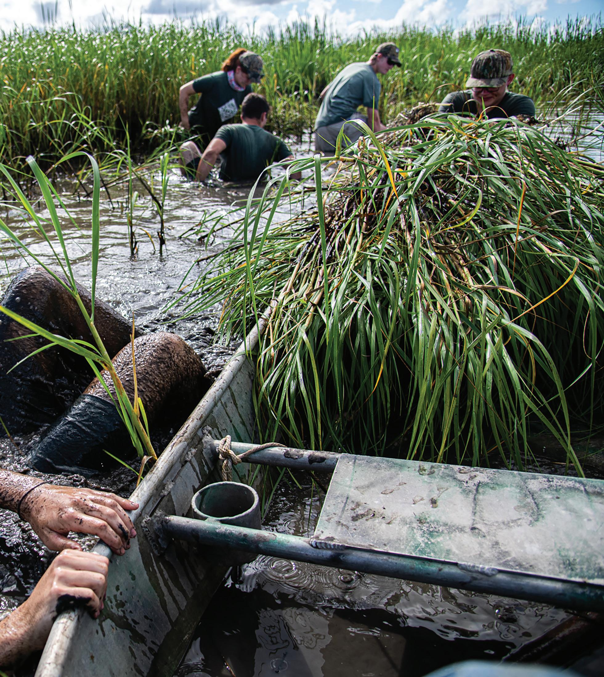 In an effort to fight coastal erosion, McIlhenny Summer Program workers Felix Osborn, Charlotte Leavitt, Dreyke Thibodeaux, Pipes Fitz-Hugh, and Addison Duhon transplant smooth cordgrass to protect Avery Island.