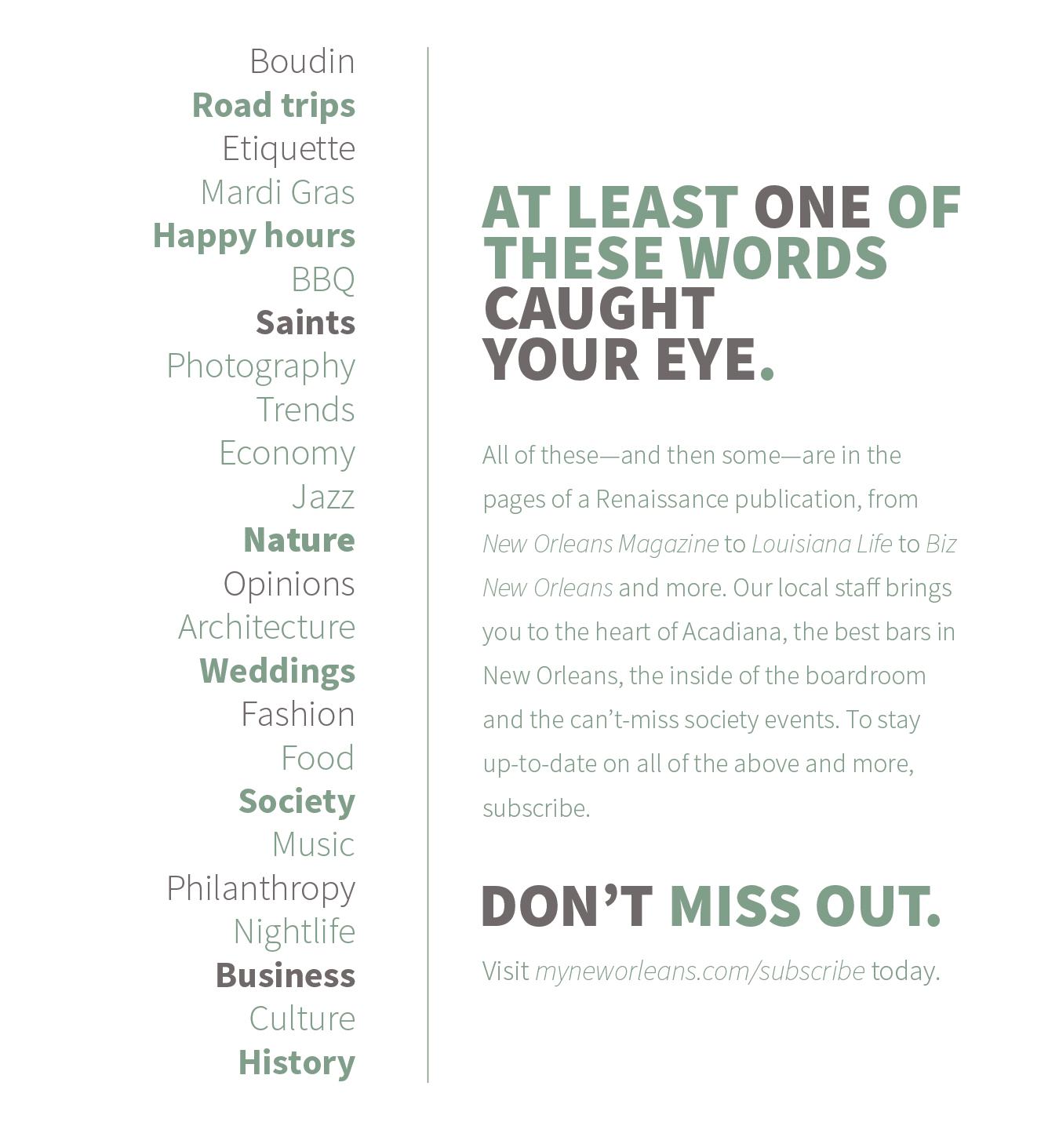 Louisiana Life (ISSN 1042-9980) is published bimonthly by Renaissance Publishing, LLC, 110 Veterans Blvd., Suite 123, Metairie, LA 70005; (504) 828-1380. Subscription rate: One year $10; Mexico and Canada $48. Periodicals postage paid at Metairie, LA, and additional mailing entry offices. POSTMASTER: Send address changes to Louisiana Life, 110 Veterans Blvd., Suite 123, Metairie, LA 70005.