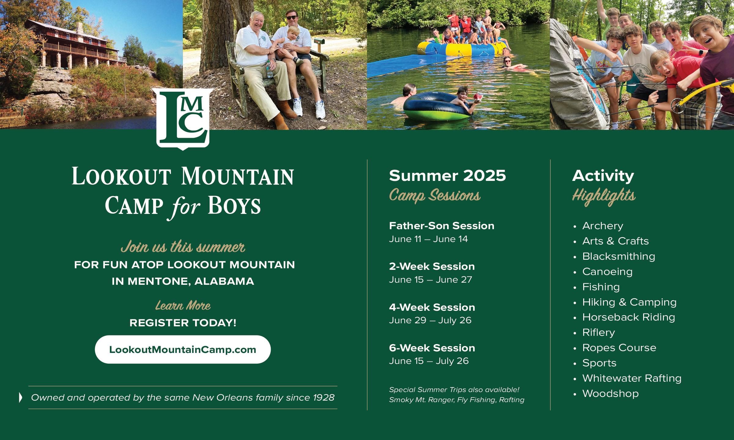 Established in 1928, Lookout Mountain Camp for Boys continues to be owned and operated by the same New Orleans family to this day. Surrounded by lush forest, LMC was built on the crest of Lookout Mountain with a river that flows right through the middle of the grounds, providing the ultimate setting for swimming and water sports. Our team of dedicated counselors, most of whom were former campers, specialize in crafting an unforgettable summer through a wide range of activities including archery, arts and crafts, backpacking, badminton, basketball, baseball, battle ball, blacksmithing, camping, canoeing, capture-the-flag, football, fly fishing, golf, hiking, horseback riding, riflery, ropes course, tennis, tetherball, whitewater rating, woodshop, volleyball, and ziplining. We offer two, four, and six week sessions plus a special three-day Father-Son session for boys ages 5-8 to get a feel for camp life. Register today for memories and friendships that will last a lifetime!