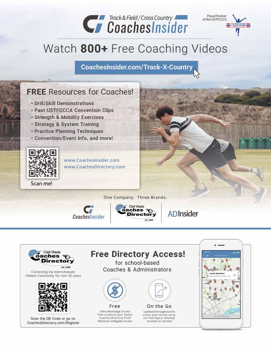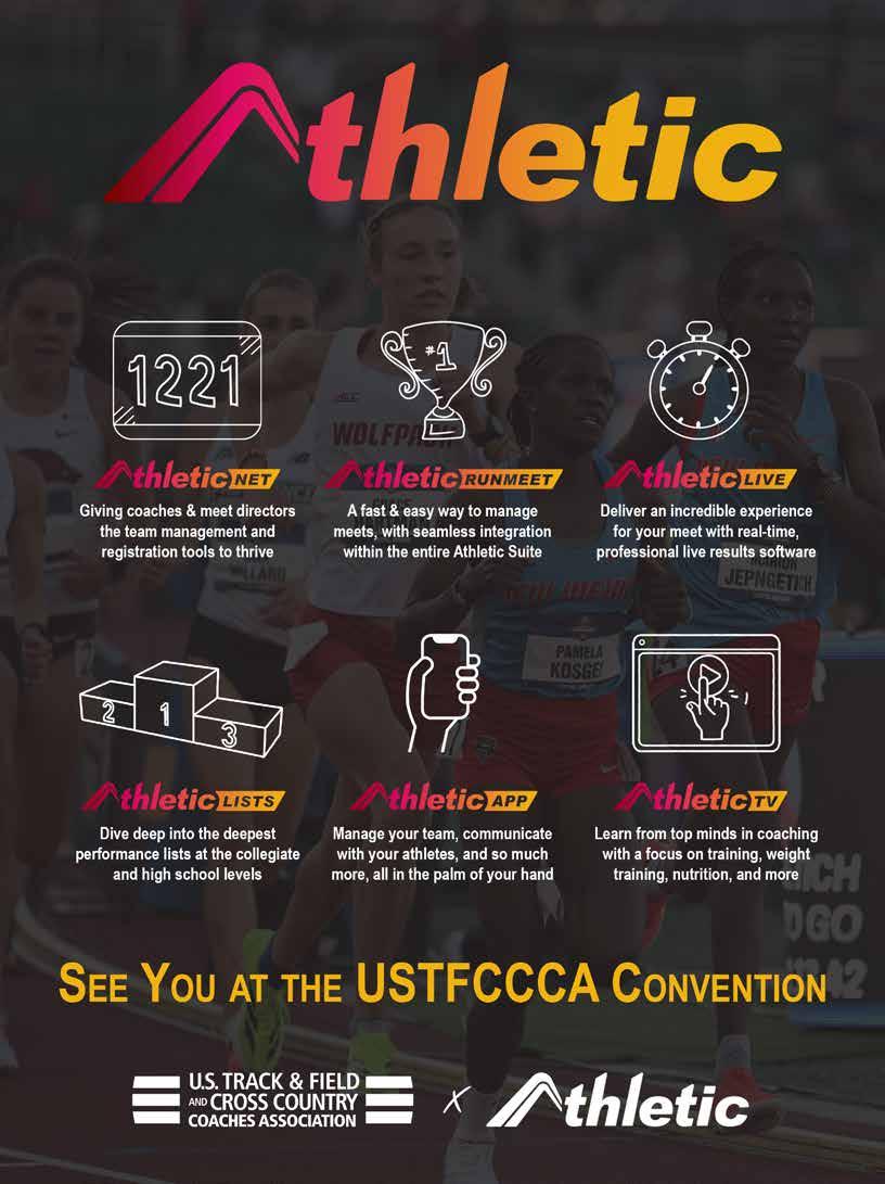 Techniques (ISSN 1939-3849) is published quarterly in February, May, August and November by the U.S. Track & Field and Cross Country Coaches Association. Copyright 2025. All rights reserved. No part of this publication may be reproduced in any manner, in whole or in part, without the permission of the publisher. techniques is not responsible for unsolicited manuscripts, photos and artwork even if accompanied by a self-addressed stamped envelope. The opinions expressed in techniques are those of the authors and do not necessarily reflect the view of the magazines’ managers or owners. Periodical Postage Paid at New Orleans La and Additional Entry Offices. POSTMASTER: Send address changes to: USTFCCCA, PO Box 55969, Metairie, LA 70055-5969.