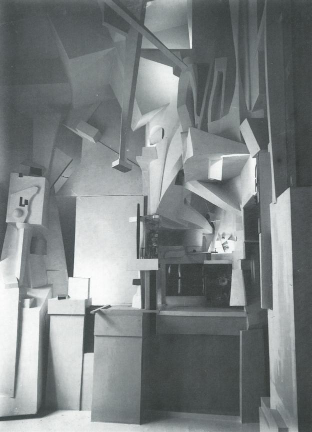 Primeira sala da Feira Internacional Dadá de Berlim com os cartazes e inscrições, 1920. Acima da porta, capa da revista Neue Jugend; sobre o púlpito, colagem perdida de Johannes Baader [First room of the Dada International Fair in Berlin with the posters and inscriptions, 1920. Above the door, the Neue Jugend magazine cover; over the pulpit, a lost collage by Johannes Baader]
