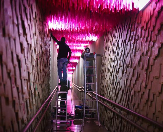 Para realizarmos, montamos a obra dos artistas Guga Ferraz e Daniel Castanheira, RAMPA Sound System/Robson Affini, instalamos uma cobertura de MDF nos vidros do museu para proteção onde contratamos