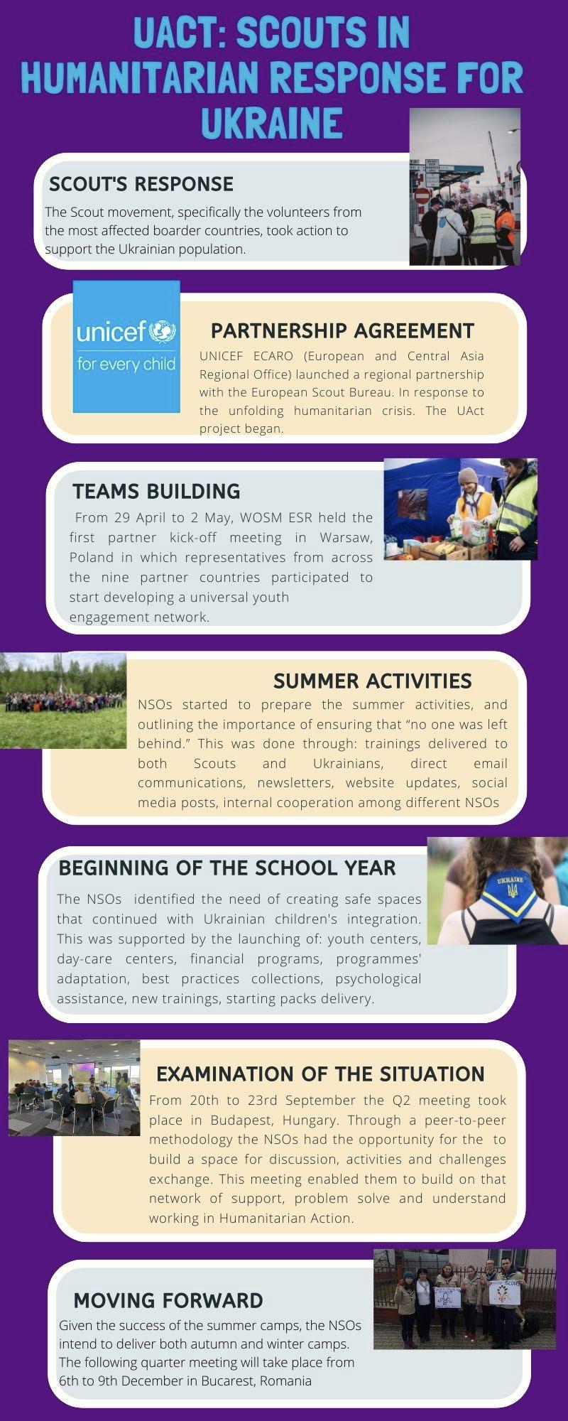 LLastly, concluding UAct the country NSOs, supported by the European and Eurasia Scout Regions, will have created strong national partnerships with National UNICEF Country offices and facilitate the ongoing collaboration to respond to humanitarian crisis. Already, Poland, Romania, Moldova, Hungary and Czechia are finding way to collaborate and increase the impact on a national level.