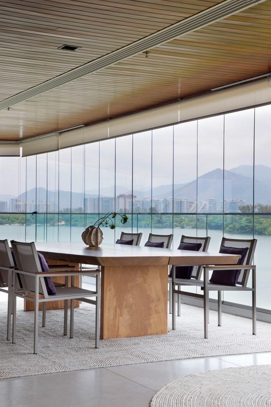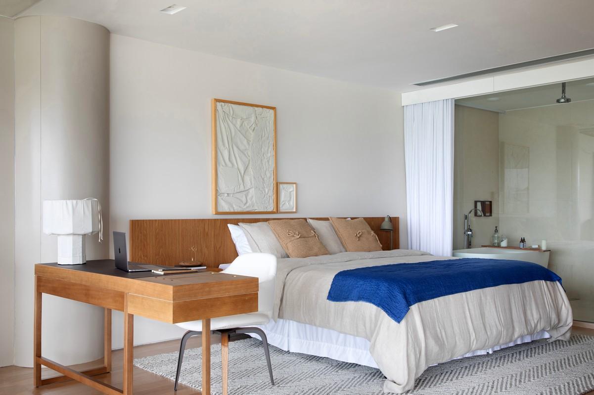 O quarto do casal e o banheiro se integram com essa vista exuberante da lagoa de Marapendi. A mesa redonda da varanda serve de escritório e em dia de festas apoio para refeições. Nesse ambiente mais uma vez tons neutros, madeira e pinceladas de azul. O banheiro pode ser fechado com cortinas de gaze de linho branco.
