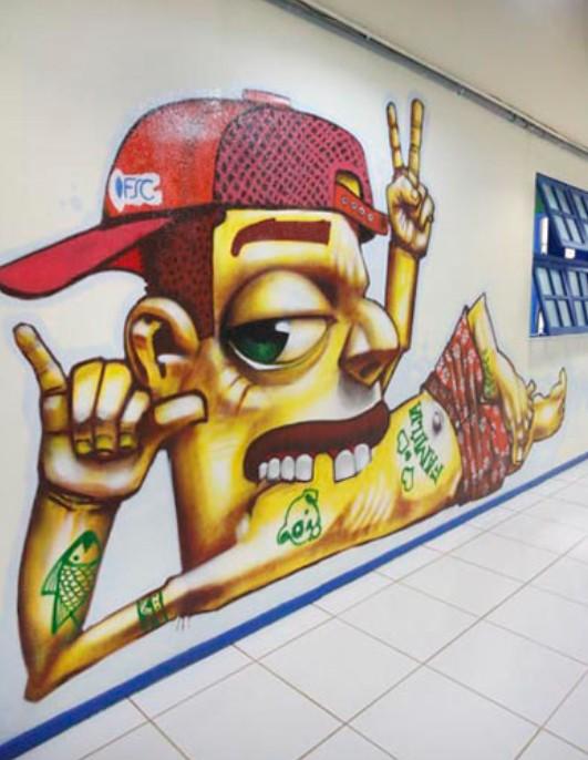 O corredor, que era aquele túnel escuro, ganhou luz com a abertura de janelas em todas as salas e personalidade com grafite do Acme, artista da comunidade.