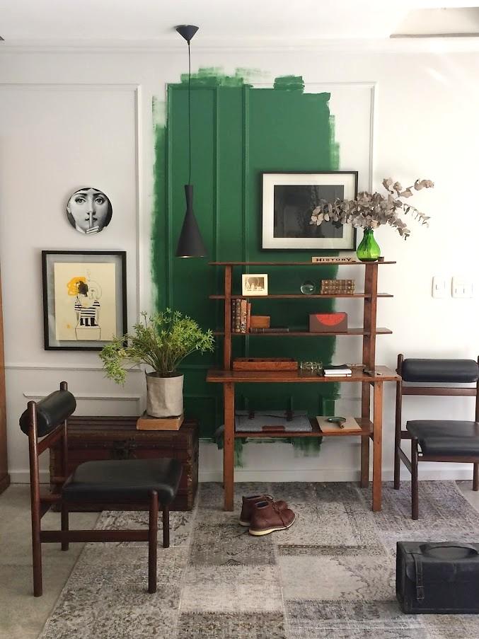 Técnicamente, a sala de lixa deve ter as paredes escuras para contrastar com o shape e facilitar o trabalho. Em vez do preto, optamos pelo verde, que causa o contraste necessário, mas não escurece tanto.