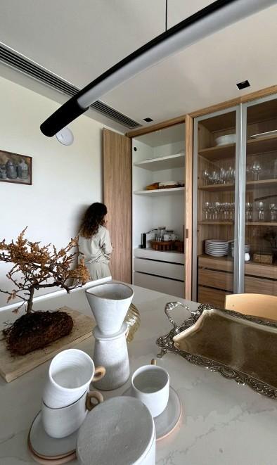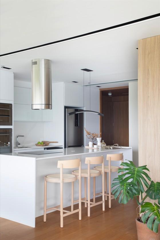 Para atender as novas dinâmicas da casa a cozinha agora só tem abertura para a varanda, a ilha foi aumentada e um grande armário foi criado funcionando como despensa e louceiro.