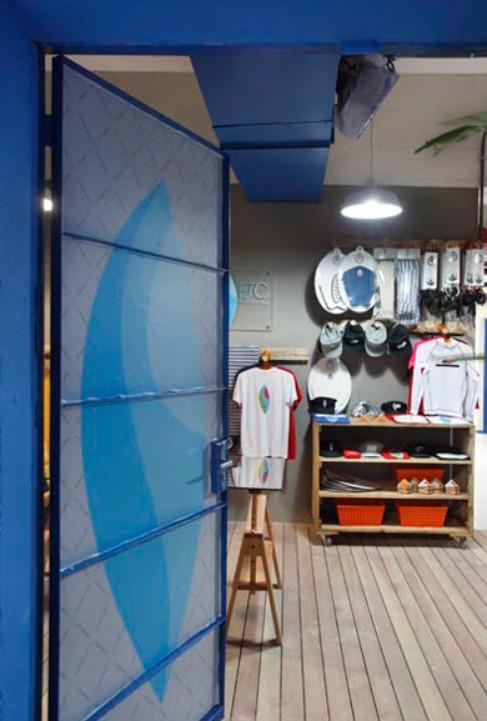 A loja acompanha a estética do surfe, com piso de deck e displays e estantes feitos com o reaproveitamento do cedrinho – que é a madeira utilizada na obra para andaimes e tapumes