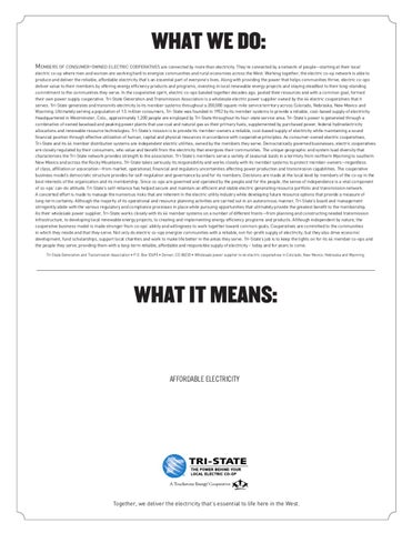 WHAT WE DO: MEMBERS OF CONSUMER-OWNED ELECTRIC COOPERATIVES are connected by more than electricity. They’re connected by a network of people—starting at their local electric co-op where men and women are working hard to energize communities and rural economies across the West. Working together, the electric co-op network is able to produce and deliver the reliable, affordable electricity that’s an essential part of everyone’s lives. Along with providing the power that helps communities thrive, electric co-ops deliver value to their members by offering energy efficiency products and programs, investing in local renewable energy projects and staying steadfast to their long-standing commitment to the communities they serve. In the cooperative spirit, electric co-ops banded together decades ago, pooled their resources and with a common goal, formed their own power supply cooperative. Tri-State Generation and Transmission Association is a wholesale electric power supplier owned by the 44 electric cooperatives that it serves. Tri-State generates and transmits electricity to its member systems throughout a 200,000 square-mile service territory across Colorado, Nebraska, New Mexico and Wyoming. Ultimately serving a population of 1.5 million consumers, Tri-State was founded in 1952 by its member systems to provide a reliable, cost-based supply of electricity. Headquartered in Westminster, Colo., approximately 1,200 people are employed by Tri-State throughout its four-state service area. Tri-State’s power is generated through a combination of owned baseload and peaking power plants that use coal and natural gas as their primary fuels, supplemented by purchased power, federal hydroelectricity allocations and renewable resource technologies. Tri-State’s mission is to provide its member-owners a reliable, cost-based supply of electricity while maintaining a sound financial position through effective utilization of human, capital and physical resources in accordance with cooperative principles. As consumer-owned electric cooperatives, Tri-State and its 44 member distribution systems are independent electric utilities, owned by the members they serve. Democratically governed businesses, electric cooperatives are closely regulated by their consumers, who value and benefit from the electricity that energizes their communities. The unique geographic and system load diversity that characterizes the Tri-State network provides strength to the association. Tri-State’s members serve a variety of seasonal loads in a territory from northern Wyoming to southern New Mexico and across the Rocky Mountains. Tri-State takes seriously its responsibility and works closely with its member systems to protect member-owners—regardless of class, affiliation or association—from market, operational, financial and regulatory uncertainties affecting power production and transmission capabilities. The cooperative business model’s democratic structure provides for self-regulation and governance by and for its members. Decisions are made at the local level by members of the co-op in the best interests of the organization and its membership. Since co-ops are governed and operated by the people and for the people, the sense of independence is a vital component of co-ops’ can-do attitude. Tri-State’s self-reliance has helped secure and maintain an efficient and stable electric generating resource portfolio and transmission network. A concerted effort is made to manage the numerous risks that are inherent in the electric utility industry while developing future resource options that provide a measure of long-term certainty. Although the majority of its operational and resource planning activities are carried out in an autonomous manner, Tri-State’s board and management stringently abide with the various regulatory and compliance processes in place while pursuing opportunities that ultimately provide the greatest benefit to the membership. As their wholesale power supplier, Tri-State works closely with its 44 member systems on a number of different fronts—from planning and constructing needed transmission infrastructure, to developing local renewable energy projects, to creating and implementing energy efficiency programs and products. Although independent by nature, the cooperative business model is made stronger from co-ops’ ability and willingness to work together toward common goals. Cooperatives are committed to the communities in which they reside and that they serve. Not only do electric co-ops energize communities with a reliable, not-for-profit supply of electricity, but they also drive economic development, fund scholarships, support local charities and work to make life better in the areas they serve. Tri-State’s job is to keep the lights on for its 44 member co-ops and the people they serve, providing them with a long-term reliable, affordable and responsible supply of electricity – today and for years to come. Tri-State Generation and Transmission Association • P.O. Box 33695 • Denver, CO 80233 • Wholesale power supplier to 44 electric cooperatives in Colorado, New Mexico, Nebraska and Wyoming.