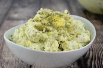 In medium bowl, whisk together sour cream, horseradish, remaining salt, pepper and chives. Add mixture to mashed potatoes. Add reserved water. Mash to combine.