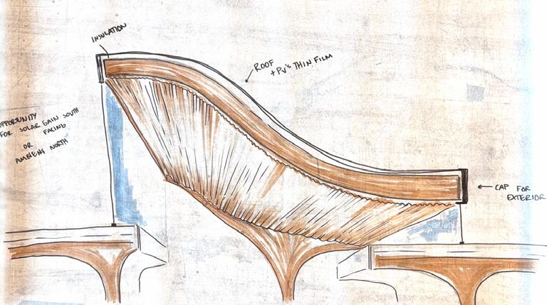 Using mass timber to rebuild the new wind and solar atrium can reduce the embodied energy by 20-50% compared to concrete construction.