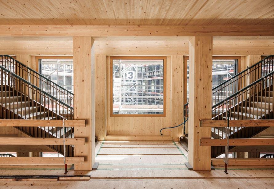 Les imposants éléments en bois pesant jusqu’à 4.5 tonnes apparaissent et sont mis en valeur dans l'atrium du nouveau bâtiment de l’administration cantonale (voir également la page de couverture).