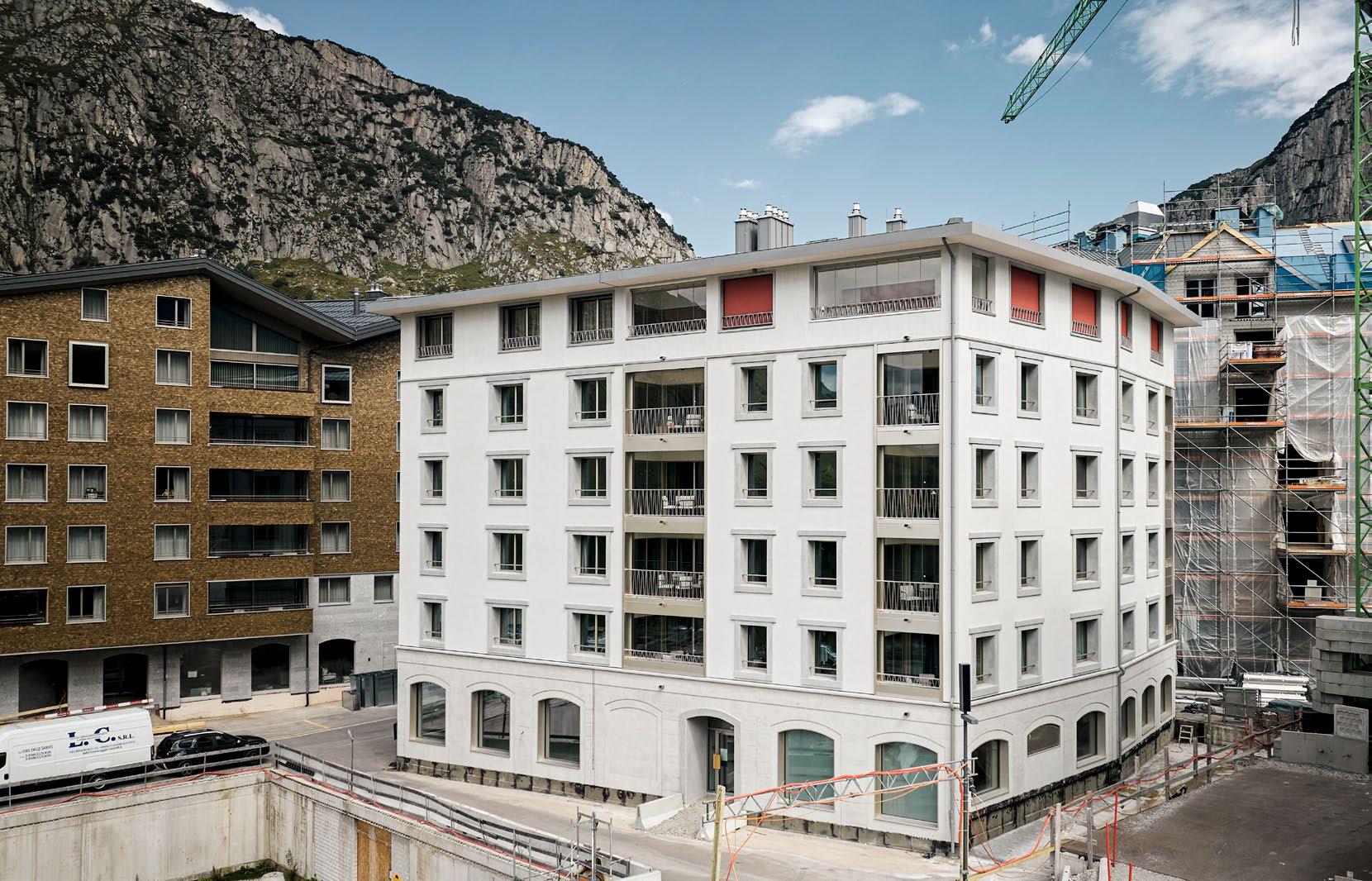 Dans la station de sports d’hiver d’Andermatt, située à 1444 mètres d’altitude, les délais pour les projets de construction sont courts et l’espace restreint dans le nouveau quartier d’Andermatt Reuss. Deux luxueux immeubles d'habitation y ont pourtant vu le jour. Il n’a fallu que six mois pour réaliser chacun d’entre eux. La construction bois a rendu cela possible grâce à notre planification flexible et à la collaboration étroite avec l’entreprise totale et le bureau d'architecture. Nous avons pu répondre aux exigences élevées du maître d’ouvrage relatives à la qualité, au contrôle des coûts et au respect des délais.