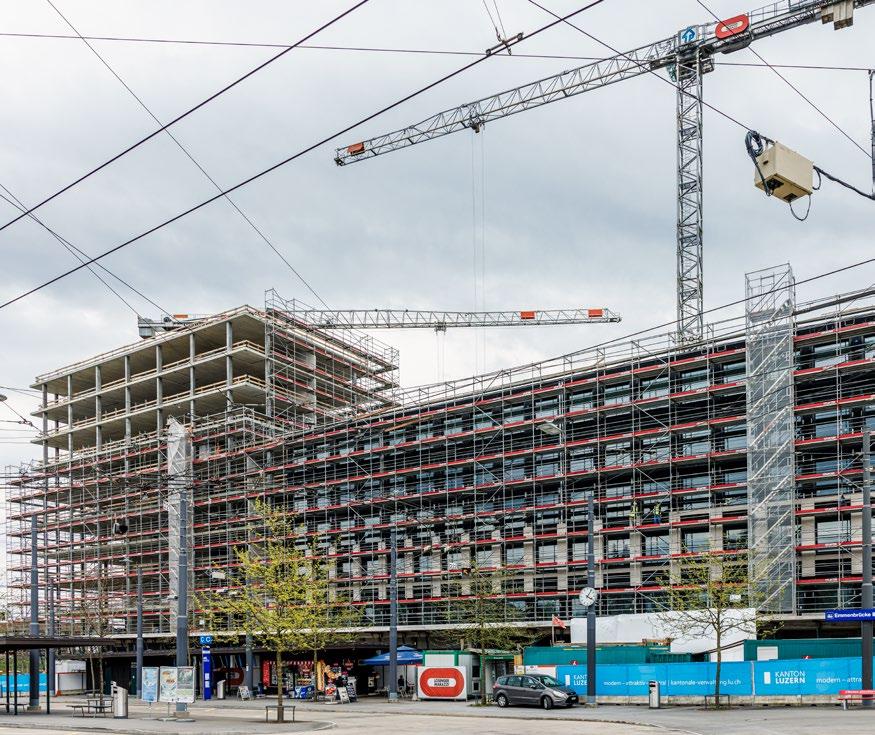 Tant de matériaux et si peu d’espace ! Le chantier d’Emmen est très bien situé en ce qui concerne les transports mais les routes cantonales donnent directement sur le chantier. Quand il n’y a pas de place pour de grands entrepôts de matériaux, un timing précis est indispensable : ce qui est livré doit être immédiatement utilisé et ce qui est nécessaire au montage doit arriver à temps et dans le bon ordre. Un défi logistique que nous relevons volontiers.