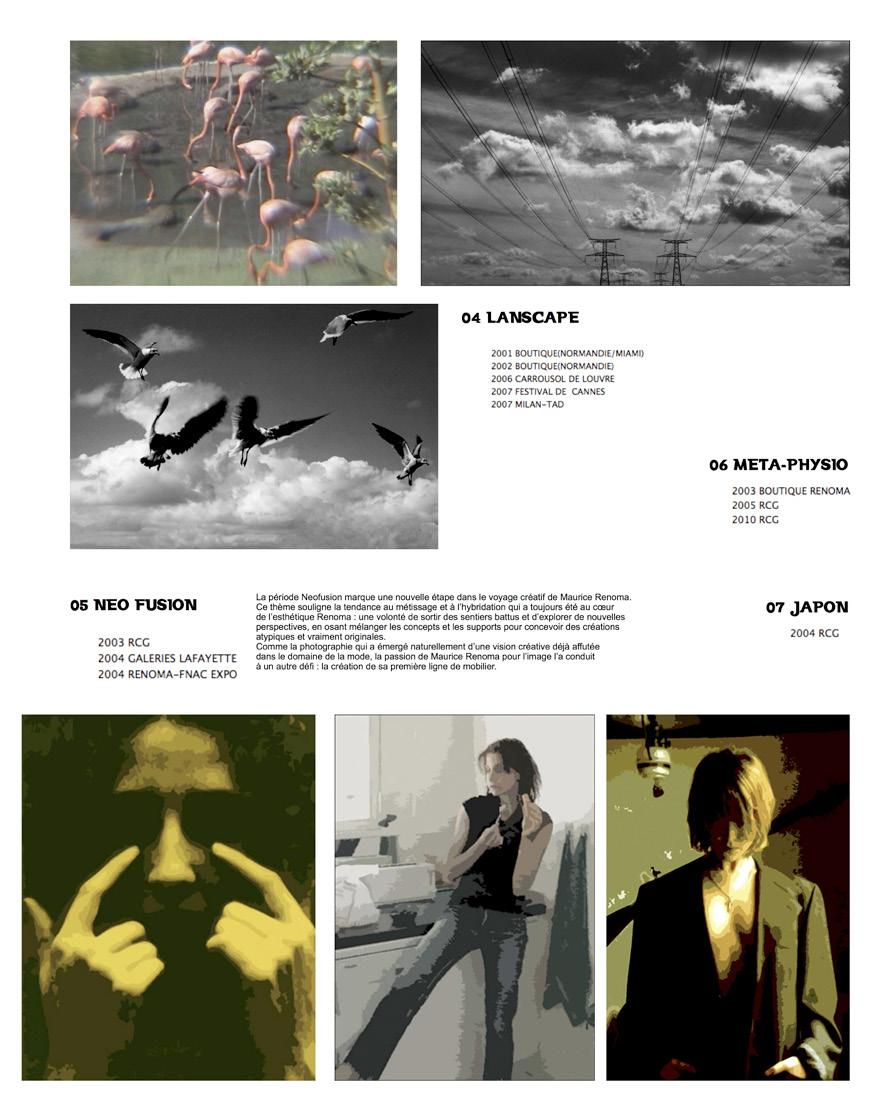 Le parcours de Maurice Renoma se présente comme une suite continue d’expériences et de productions visuelles sur des supports différents : il passe de l’ar gentique au numérique, du noir et blanc à la cou leur, du nu au paysage et à la nature morte. Il en registre des images et quelque temps plus tard, les retravaille sur un écran, les remonte, les recycle. Ses images sont toujours prêtes à revivre dans un autre contexte, à subir un traitement qui en change la na ture et la forme, étant conçues comme de la matière à modeler.
