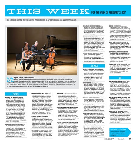 FOr tHE WEEK OF FEBrUArY 2, 2017 For a complete listing of this week’s events or to post events to our online calendar, visit www.newsreview.com. RENO/TAHOE SENIOR WINTER GAMES: The