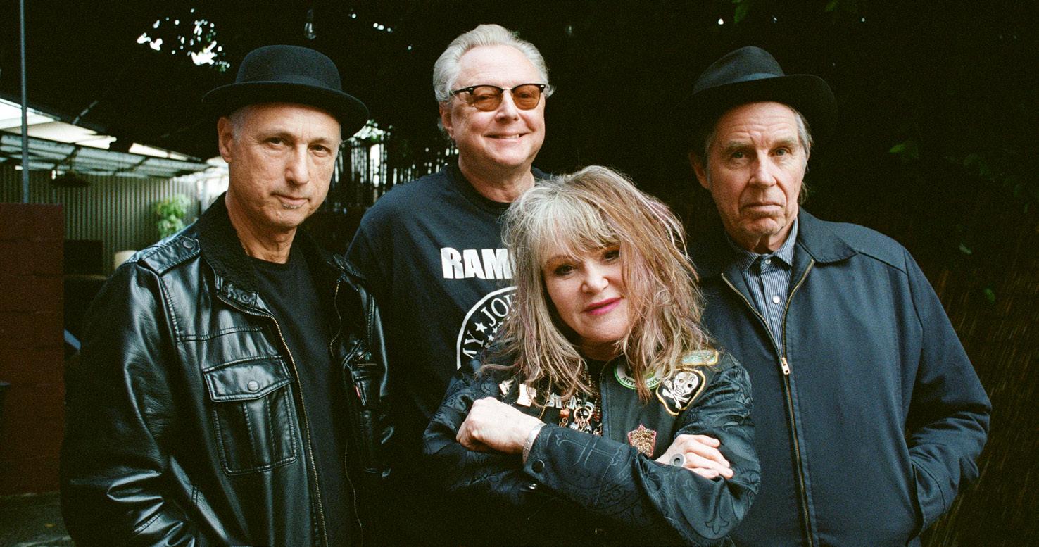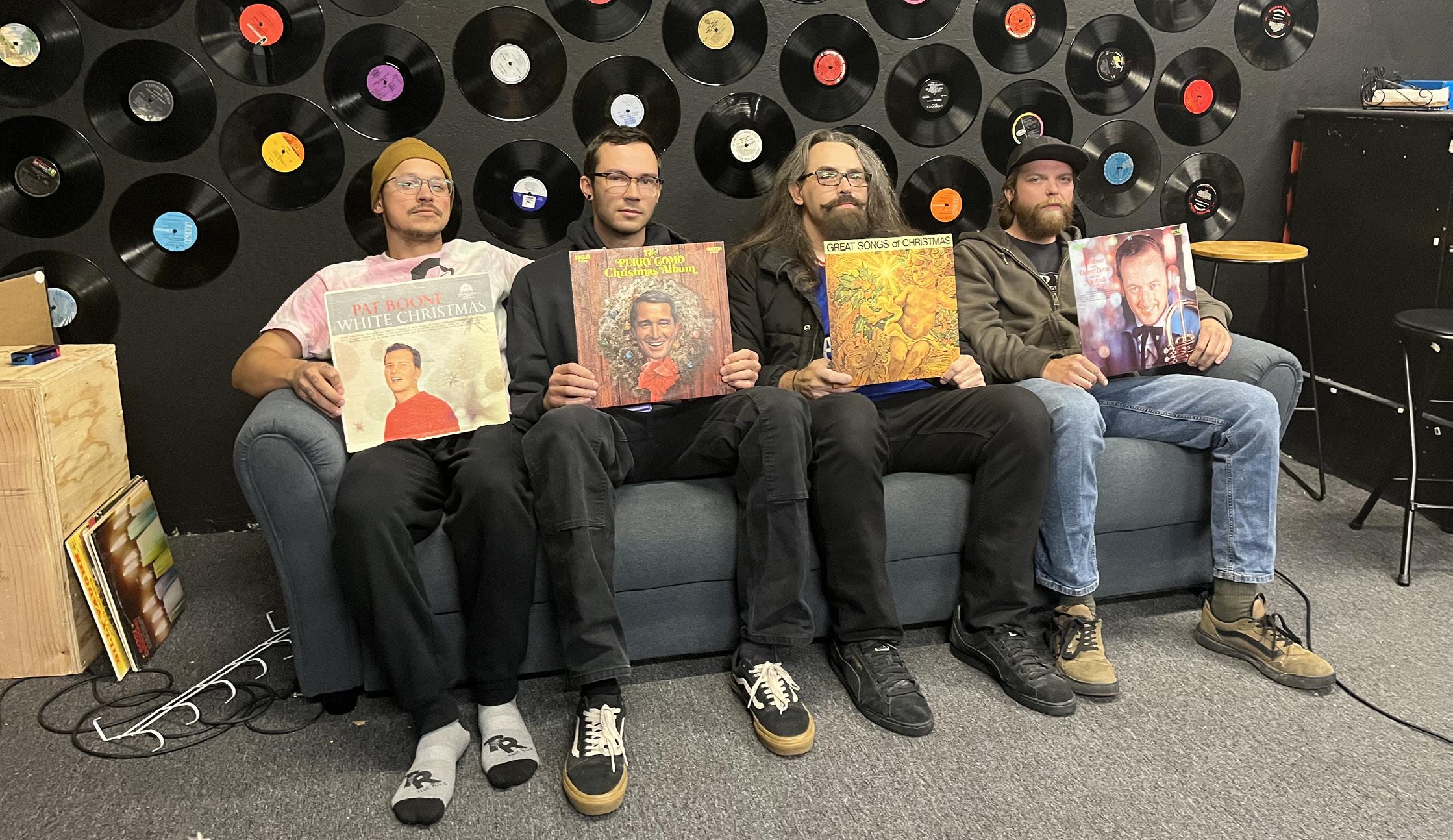 Giant Skunk at its practice space, where one wall is festooned with used Christmas albums. From left: Edson Junior, Rhett Lila, Daniel Zulian and Brayden Tripp. Photo/ Mark Earnest