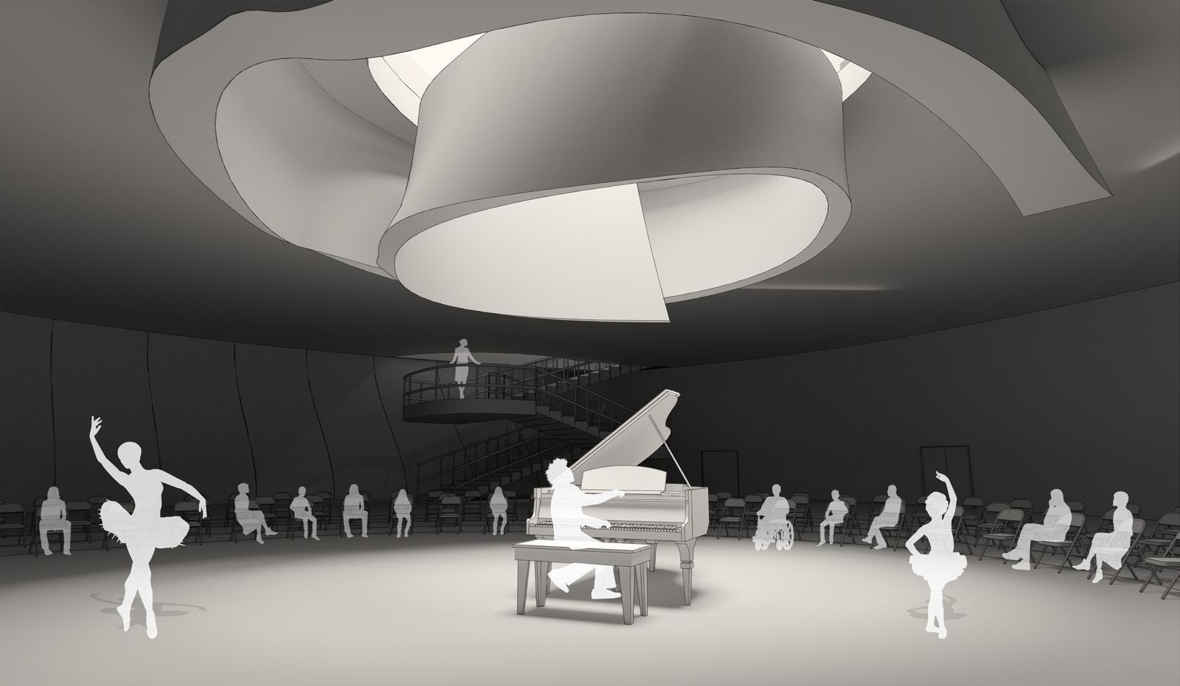 The basement level, while serving spaces for physical activities, is primarily dedicated to performance arts. The axis of the oculus focuses on the performer.