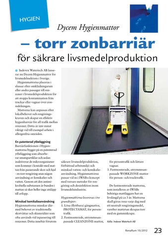 för säkrare livsmedelproduktion Indevex Watertech AB lanse rar nu Dycem Hygienmattor för livsmedelssektorn i Sverige. Hygienmattorna placeras i slussar efter omklädningsrum eller andra passager till ren zoner i livsmedelsproduktion för att stoppa kontamination från truckar eller vagnar över zon indelningen. Mattorna kan anpassas efter lokalbehovet och rengörings kraven och skapar en effektiv hygienbarriär för all trafik mellan renzoner. Detta är inte minst viktigt vid till exempel arbete i allergenfria områden.
