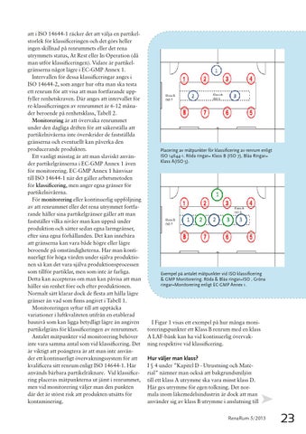 att i ISO 14644-1 räcker det att välja en partikel storlek för klassificeringen och det görs heller ingen skillnad på renrummets eller det rena utrymmets status, At Rest eller In Operation (då man utför klassificeringen). Vidare är partikel gränserna något lägre i EC-GMP Annex 1. Intervallen för dessa klassificeringar anges i ISO 14644-2, som anger hur ofta man ska testa ett renrum för att visa att man fortfarande upp fyller renhetskraven. Där anges att intervallet för re-klassificeringen av renrummet är 6-12 måna der beroende på renhetsklass, Tabell 2. Monitorering är att övervaka renrummet under den dagliga driften för att säkerställa att partikelnivåerna inte överskrider de fastställda gränserna och eventuellt kan påverka den producerande produkten. Ett vanligt misstag är att man slaviskt använ der partikelgränserna i EC-GMP Annex 1 även för monitorering. EC-GMP Annex 1 hänvisar till ISO 14644-1 när det gäller arbetsmetoden för klassificering, men anger egna gränser för partikelnivåerna. För monitorering eller kontinuerlig uppföljning av att renrummet eller det rena utrymmet fortfa rande håller sina partikelgränser gäller att man fastställer vilka nivåer man kan uppnå under produktion och sätter sedan egna larmgränser, efter sina egna förhållanden. Det kan innebära att gränserna kan vara både högre eller lägre beroende på omständigheterna. Har man konti nuerligt för höga värden under själva produktio nen så kan det vara själva produktionsprocessen som tillför partiklar, men som inte är farliga. Detta kan accepteras om man kan påvisa att man håller sin renhet före och efter produktionen. Normalt sätt klarar dock de flesta att hålla lägre gränser än vad som finns angivet i Tabell 1. Monitoreringen syftar till att upptäcka variationer i luftkvaliteten utifrån en etablerad basnivå som kan ligga betydligt lägre än angiven partikelgräns för klassificeringen av renrummet. Antalet mätpunkter vid monitorering behöver inte vara samma antal som vid klassificering. Det är viktigt att poängtera är att man inte använ der ett kontinuerligt övervakningssystem för att kvalificera sitt renrum enligt ISO 14644-1. Här används bärbara partikelräknare. Vid klassifice ring placeras mätpunkterna ut jämt i renrummet, men vid monitorering väljer man den punkten där det är störst risk att produkten utsätts för kontaminering.