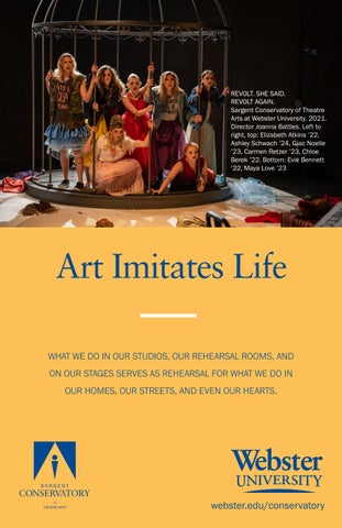 5 Art Imitates Life WHAT WE DO IN OUR STUDIOS, OUR REHEARSAL ROOMS, AND ON OUR STAGES SERVES AS REHEARSAL FOR WHAT WE DO IN OUR HOMES, OUR STREETS, AND EVEN OUR HEARTS. webster.edu/conservatoryREVOLT.SHESAID.REVOLTAGAIN.SargentConservatoryofTheatreArtsatWebsterUniversity.2021.DirectorJoannaBattles.Lefttoright,top:ElizabethAtkins’22,AshleySchwach’24,GiacNoelle’23,CarmenRetzer’23,ChloeBerek’22.Bottom:EvieBennett’22,MayaLove’23