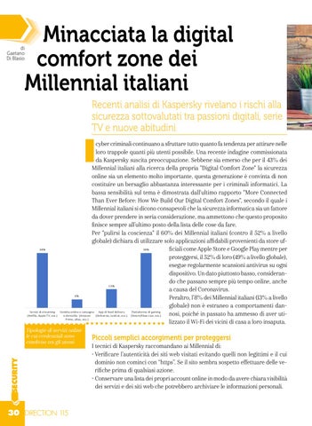 cyber criminali continuano a sfruttare tutto quanto fa tendenza per attirare nelle loro trappole quanti più utenti possibile. Una recente indagine commissionata da Kaspersky suscita preoccupazione. Sebbene sia emerso che per il 43% dei Millennial italiani alla ricerca della propria "Digital Comfort Zone" la sicurezza online sia un elemento molto importante, questa generazione è convinta di non costituire un bersaglio abbastanza interessante per i criminali informatici. La bassa sensibilità sul tema è dimostrata dall'ultimo rapporto "More Connected Than Ever Before: How We Build Our Digital Comfort Zones", secondo il quale i Millennial italiani si dicono consapevoli che la sicurezza informatica sia un fattore da dover prendere in seria considerazione, ma ammettono che questo proposito finisce sempre all’ultimo posto della lista delle cose da fare. Per "pulirsi la coscienza" il 60% dei Millennial italiani (contro il 52% a livello globale) dichiara di utilizzare solo applicazioni affidabili provenienti da store uf38% ficiali come Apple Store e Google Play mentre per proteggersi, il 52% di loro (49% a livello globale), esegue regolarmente scansioni antivirus su ogni dispositivo. Un dato piuttosto basso, considerando che passano sempre più tempo online, anche 13% a causa del Coronavirus. 6% Peraltro, l’8% dei Millennial italiani (13% a livello globale) non è estraneo a comportamenti danVendita online e consegna App di food deliver y Piattaforme di gaming nosi, poiché in passato ha ammesso di aver utia domicilio (Amazon (Deliver oo, JustEat, ecc.) (Steam/Xbox Live, ecc.) Prime, eBay , ecc.) lizzato il Wi-Fi dei vicini di casa a loro insaputa.
