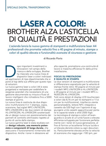trasformare facilmente i documenti cartacei in file digitali. A incrementare la produttività contribuisce anche la tecnologia a doppio laser che assicura una velocità di uscita della prima stampa inferiore a 10 secondi e una velocità di stampa in fronte-retro fino a 40 pagine al minuto.