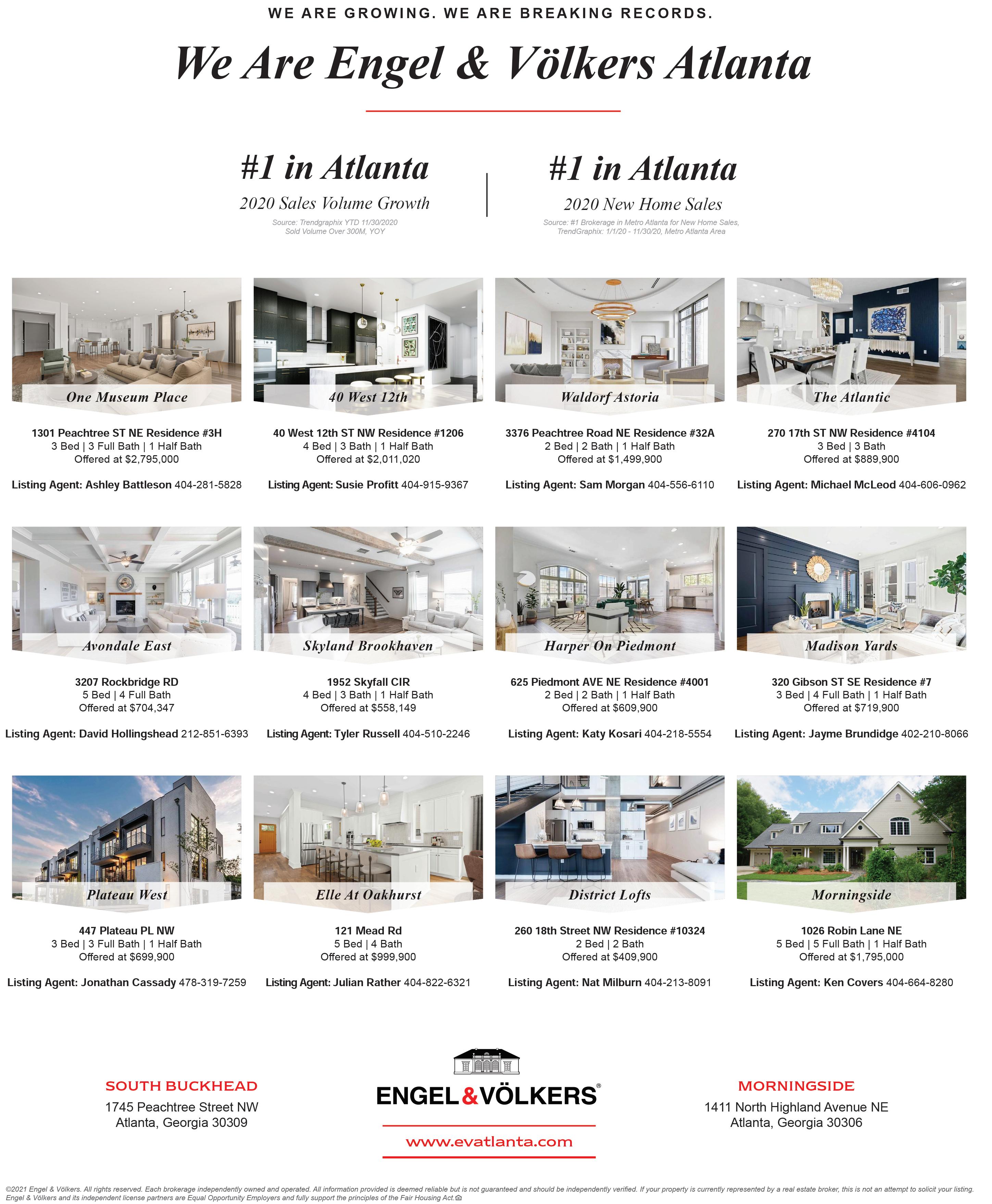 the market is very strong, but when selling your home, you never want to take just the QUICK SALE price, you want to take the RIGHT PRICE. Having a strong plan in place has never been more important, and that is my strength. Deemed the Morningside specialist by locals and clients alike, I currently take the lead for total closings in all price points in the neighborhood and have for 5 years As a 17-year resident of Morningside, I don’t know of a bigger fan or ambassador of all things Morningside— this is truly one of the best places to live and call home! A Note From Ken UNDER CONTRACT OFFERED FOR $1,895,000 5 BED | 5 BATH | 1 HALF BATH Pristine move-right-in-condition on 1.9 acres. Oversized rooms, high ceilings, spacious walk-in closets, three finished levels, oversized master suite plus a main level guest suite. Lush landscaping surrounds the entire residence. Terrace level, home gym, media room. 1026 Robin Lane N.E. UNDER CONTRACT OFFERED FOR $859,000 3 BED | 3 BATH | 1 HALF BATH Classic Morningside/Johnson Cape Cod estate Tudor. Very well-maintained and loved by current owners for 30 years. Living room with fireplace and separate dining room. Lush, beautiful backyard and is nestled on a quiet street near Noble Park. 1658 Noble Drive N.E. ACTIVE LISTING OFFERED FOR $1,095,000 3 BED | 3 BATH | 1 HALF BATH 1316 N. Highland N.E. Fully modernized bungalow in vibrant Morningside. Features large rooms and high ceilings, second-floor has loft-like feel, expansive motor court that leads to elevated front porch, living room with fireplace, eat-in kitchen, rear covered porch, basement makes ideal workshop. SOLD SOLD FOR $770,000 2 BED 2 BATH Classic four-sided brick ranch in Morningside with rare detached 3-car garage. High ceilings, large living room and dining rooms, oversized master suite, third bedroom converted to a den, connects to home office that overlooks backyard. Tremendous expansion potential. 1617 Lenox Road N.E. ACTIVE LISTING OFFERED FOR $1,295,000 6 BED | 6 BATH Excellent Morningside home almost 5,000 sqft in size. Three finished levels with 6 bedrooms and 2 separate home offices—one with a separate exterior entrance. The home also features an oversized 2-car garage and abundant storage. 1748 Wildwood Road N.E. PRICE IMPROVEMENT OFFERED FOR $1,295,000 5 BED | 5 BATH | 1 HALF BATH 1332 Briarwood Drive N.E. Intown living at its best. Move-in ready, large rooms, high ceilings, open floor plan, 4-car garage. Two master suites with outstanding main level guest suite, oversized terrace level with recreation room, fifth bedroom, exercise room, full bath, kitchenette, access to garage. NEW TO MARKET OFFERED FOR $799,000 3 BED | 2 BATH Charming home filled with character in ideal location— walking to Morningside shops, restaurants and farmer’s market. Fireplace, eat-in kitchen with oversized island. Covered front porch, large rear deck, spa-like master bathroom. Fenced backyard, motor court. 1289 N. Highland Avenue N.E. COMING SOON PRICE COMING SOON 3 BED | 3 BATH Outstanding Morningside ranch home on level lot overlooking the Wildwood Urban Forest. This home features a large open floor plan, two car attached garage, and a large deck. It is located on super quiet street, and is a great place for a family. 1801 Woodcliff Terrace NE NEW TO MARKET OFFERED FOR $1,095,000 4 BED | 3 BATH Morningside/Johnson Estates home on quiet, low traffic street a block from Noble Park. Rare master on the main. Kitchen with breakfast bar, opens to cozy den and living room with fireplace. Walk-out fenced backyard, 1-car garage, basement ideal for craft or workshop. 1775 Noble Drive N.E. PRICE IMPROVEMENT OFFERED FOR $565,000 LOT This is a large estate lot in the coveted Morningside school district, and is almost 1.2 acres in total size. This lot features a private nature setting, and is a perfect place to build your dream home. Imagine your dream life in this location! 1807 Lenox Road N.E. Outstanding results take planning. Call me so we can put a winning plan in place for your home sale. Together, we will decide how best to position your home for maximum results, all while adhering to strict and safe COVID-19 practices. Your Life. Your Home. Your REALTOR®. #1 Agent in Morningside since 2017 Over $100M Sold in Morningside TRENDGRAPHIX, 2017-2020 SALES VOLUME, ZIP 30306, ALL TYPES, ALL PRICE POINTS TRENDGRAPHIX, 2017-2020, CLOSED SINGLE FAMILY HOMES, ALL PRICE POINTS ©2021 Engel & Völkers. All rights reserved. Each brokerage independently owned and operated. All information provided is deemed reliable but is not guaranteed and should be independently verified. If your property is currently represented by a real estate broker, this is not an attempt to solicit your listing. Engel & Völkers and its independent license partners are Equal Opportunity Employers and fully support the principles of the Fair Housing Act.