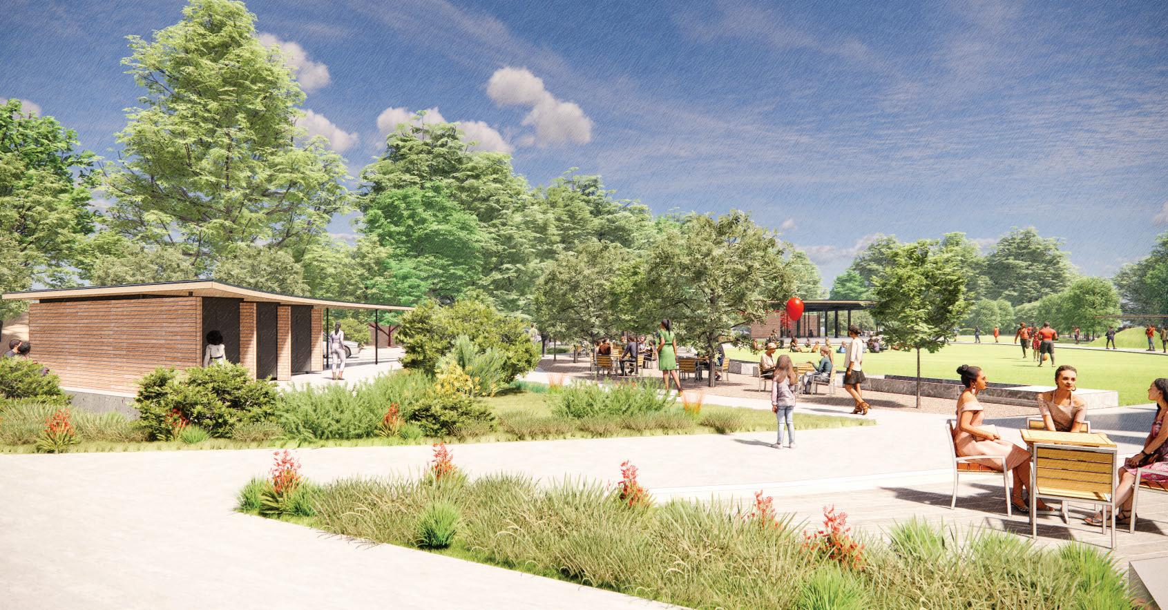 CAP unveiled renderings for the retooled initial phase of The Stitch project, showcasing features of the ¾-mile platform above the I-75/85 connector, including a performance and shade pavilion, interactive water fountain with “fog forest” capabilities, a large playground, gardens,