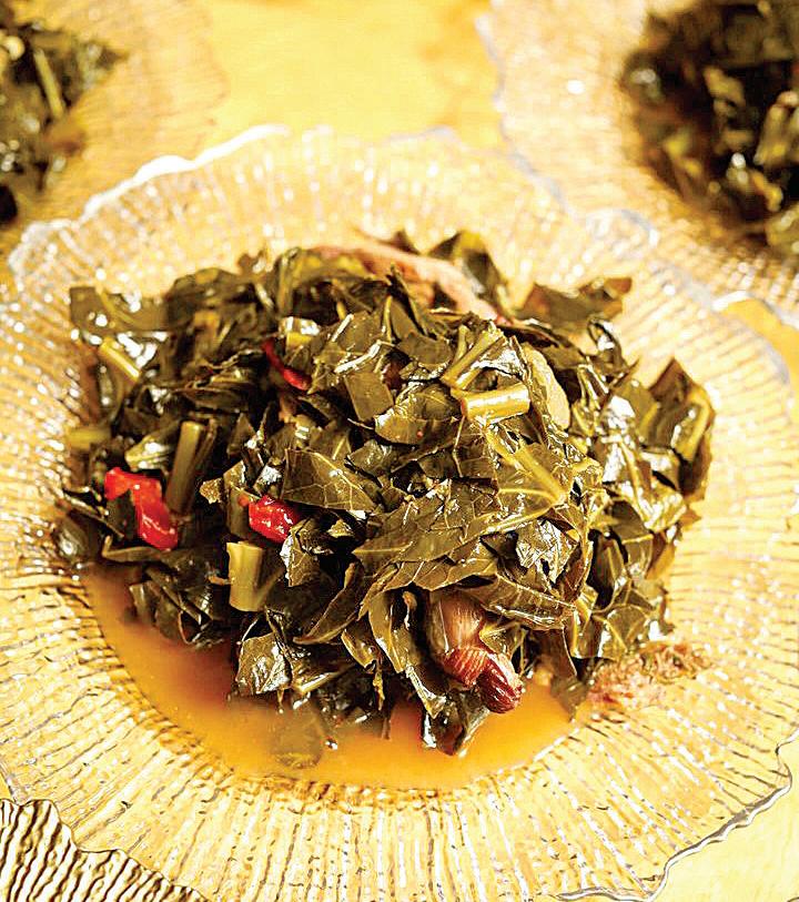 Butts’ family recipe, which he now serves at Auburn Angel, includes a triad of collards, mustard greens, and turnip greens, along with red and green peppers, onions, garlic, ham hock, and smoked turkey. He seasons the greens with hot sauce, apple cider, and a touch of brown sugar. By the time the greens are ready, Butts said, the house is engulfed with the aroma of just-braised greens for the holiday.