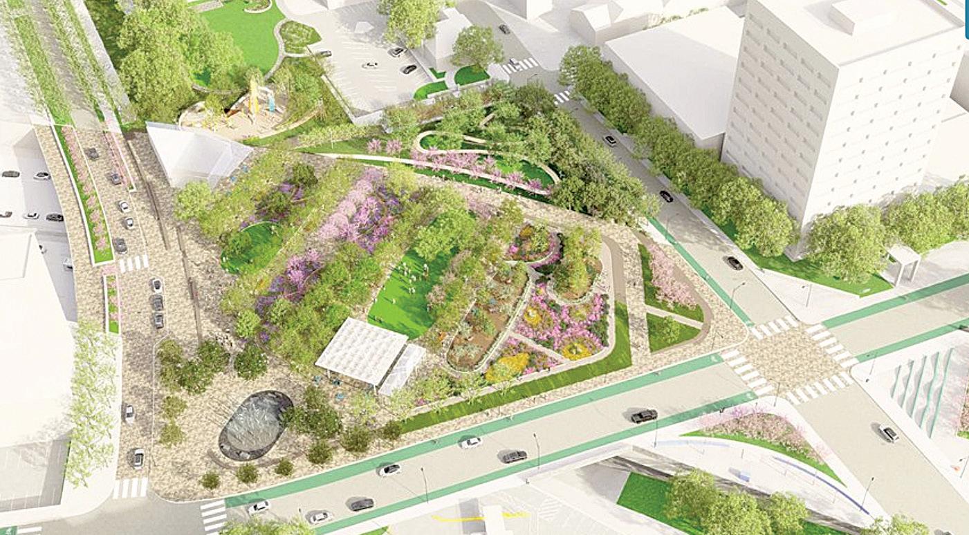 CAP unveiled renderings for the retooled initial phase of The Stitch project, showcasing features of the ¾-mile platform above the I-75/85 connector, including a performance and shade pavilion, interactive water fountain with “fog forest” capabilities, a large playground, gardens,