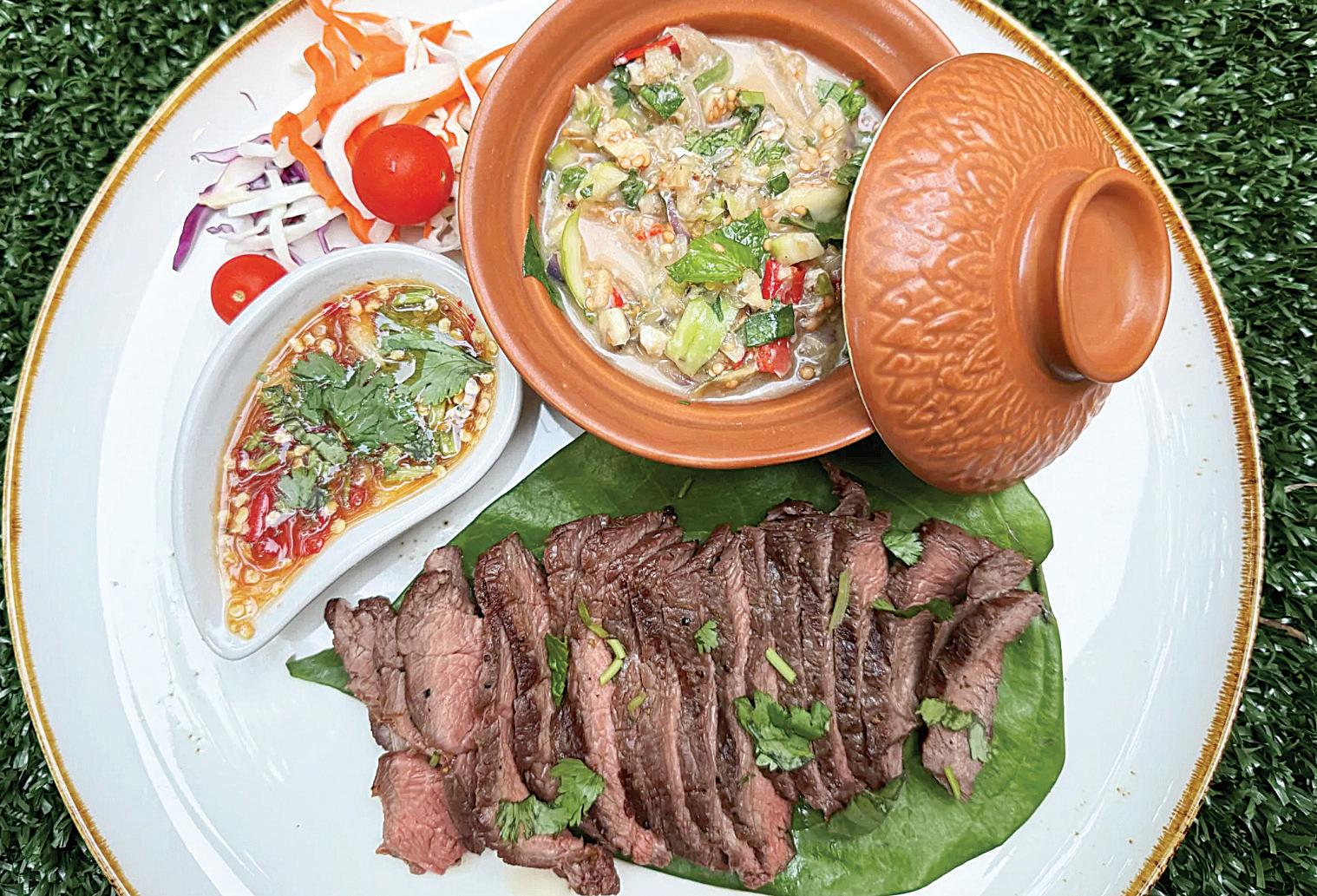 Grilled steak accompanied by Cambodian and Lao dipping sauces. (Courtesy of Thip Athakhanh)