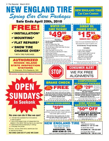 Includes: • Lube, where applicable • New oil filter installed • Up to 5 quarts major brand oil • Special oils & filter types will result in extra charges • Most U.S. & Import cars • Regular price - $30.95 Shop supplies extra. No other discounts apply. Offer ends 4-20-10. RR2 Redeem at New England Tire. Seekonk store only.